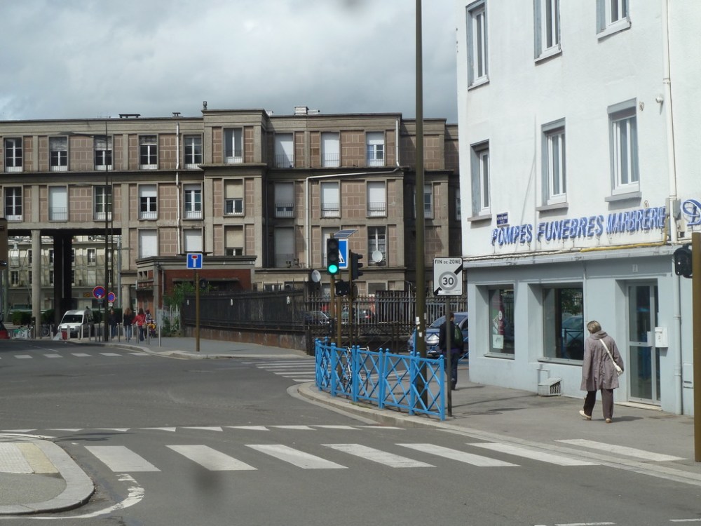 Een ongeluk komt nooit alleen want le Perret herbouwde ook het naastgelegen station. Beide gebouwen passen nergens bij maar hebben gelukkig elkaar nog. Samen vormen die muurbloempjes een baken van lelijkheid in een zo mogelijk nog troostelozer omgeving waarin zelfs de begrafenisosonderneming nog fleurig afsteekt.