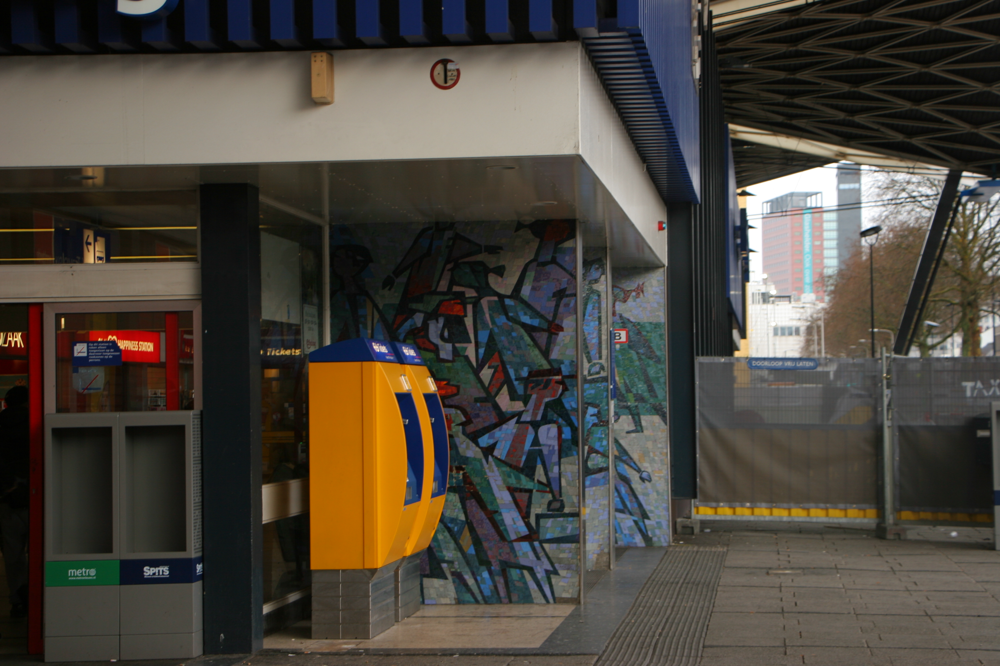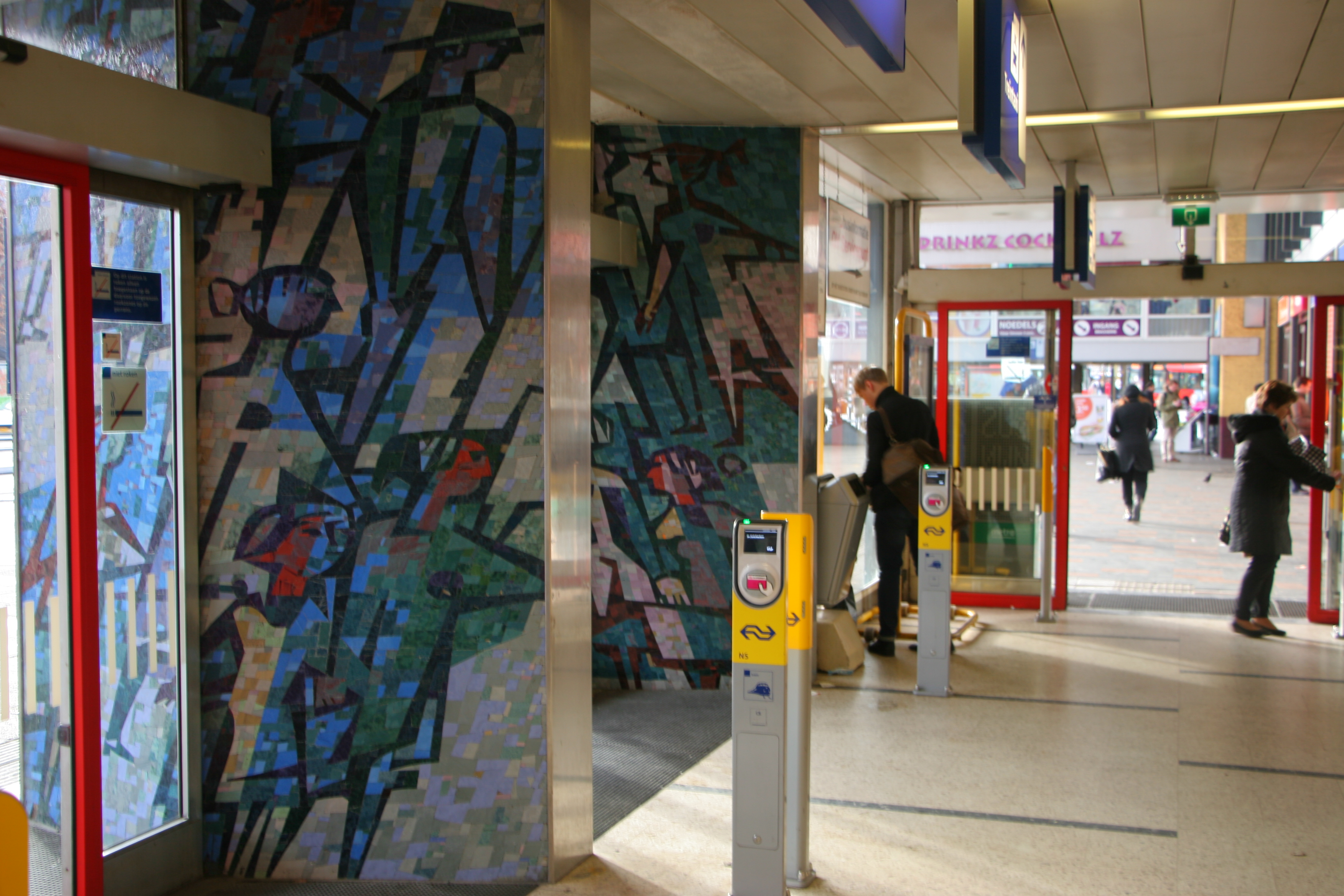Het valt niet direct op hoe prachtig dit gemaakt is, maar dat mozaïek van gehaaste reizigers is een parel in de naoorlogse stationsarchitectuur die verder meestal uitblinkt in grauw grindbeton en nauwe gangen waar altijd de geur van zweet en tabak lijkt te hangen.
