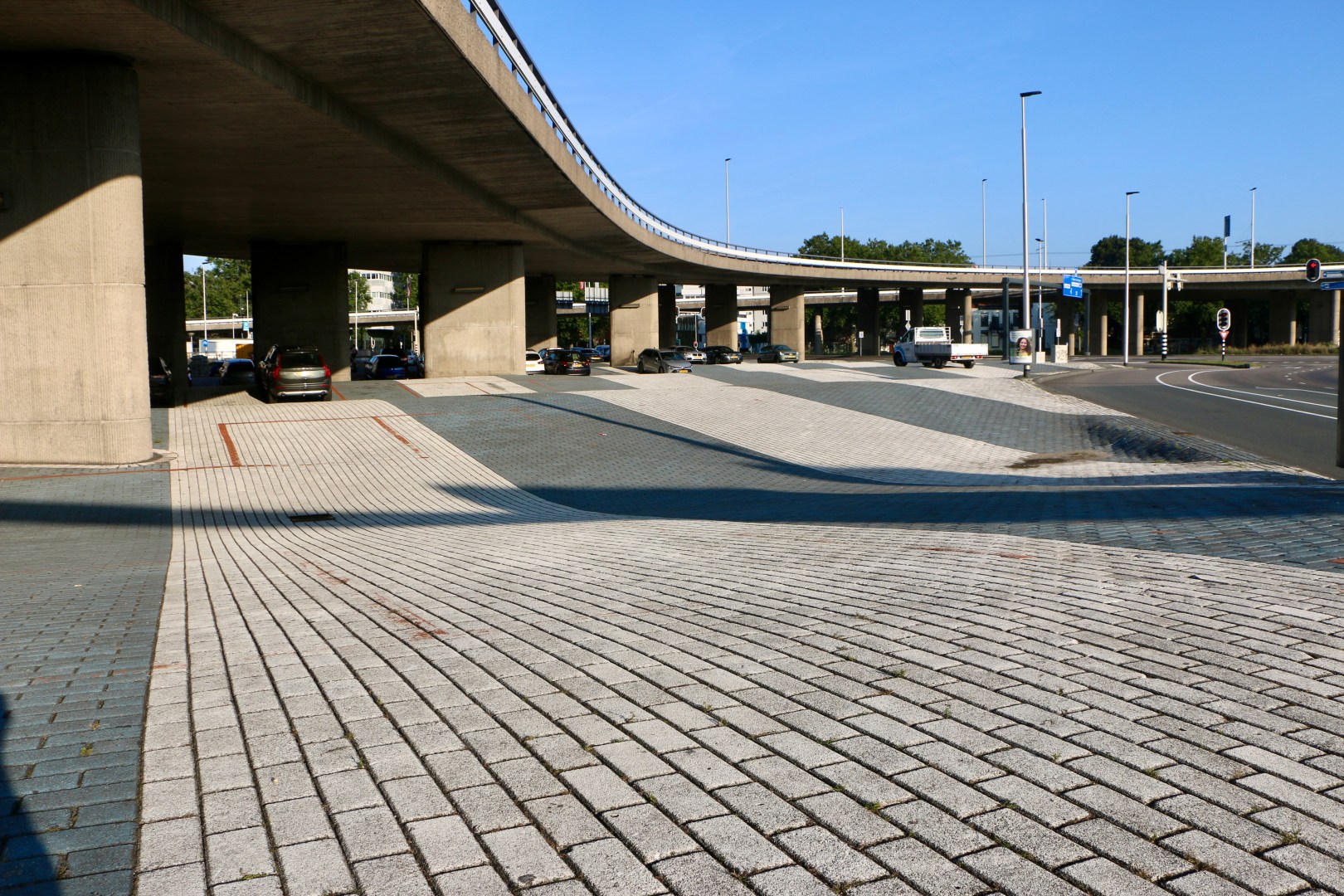 De Mandelabrug in Arnhem rust op een woud van ruw betonnen palen in een golvende woestijn van vaalblauwe en vuilwitte stenen waar her en der auto’s geparkeerd staan Dit gebied is overduidelijk door God verlaten, maar er was wel een Schepper: Het was Peter Struycken en we hebbben hier met een staaltje van zijn ruimtekunst te maken.