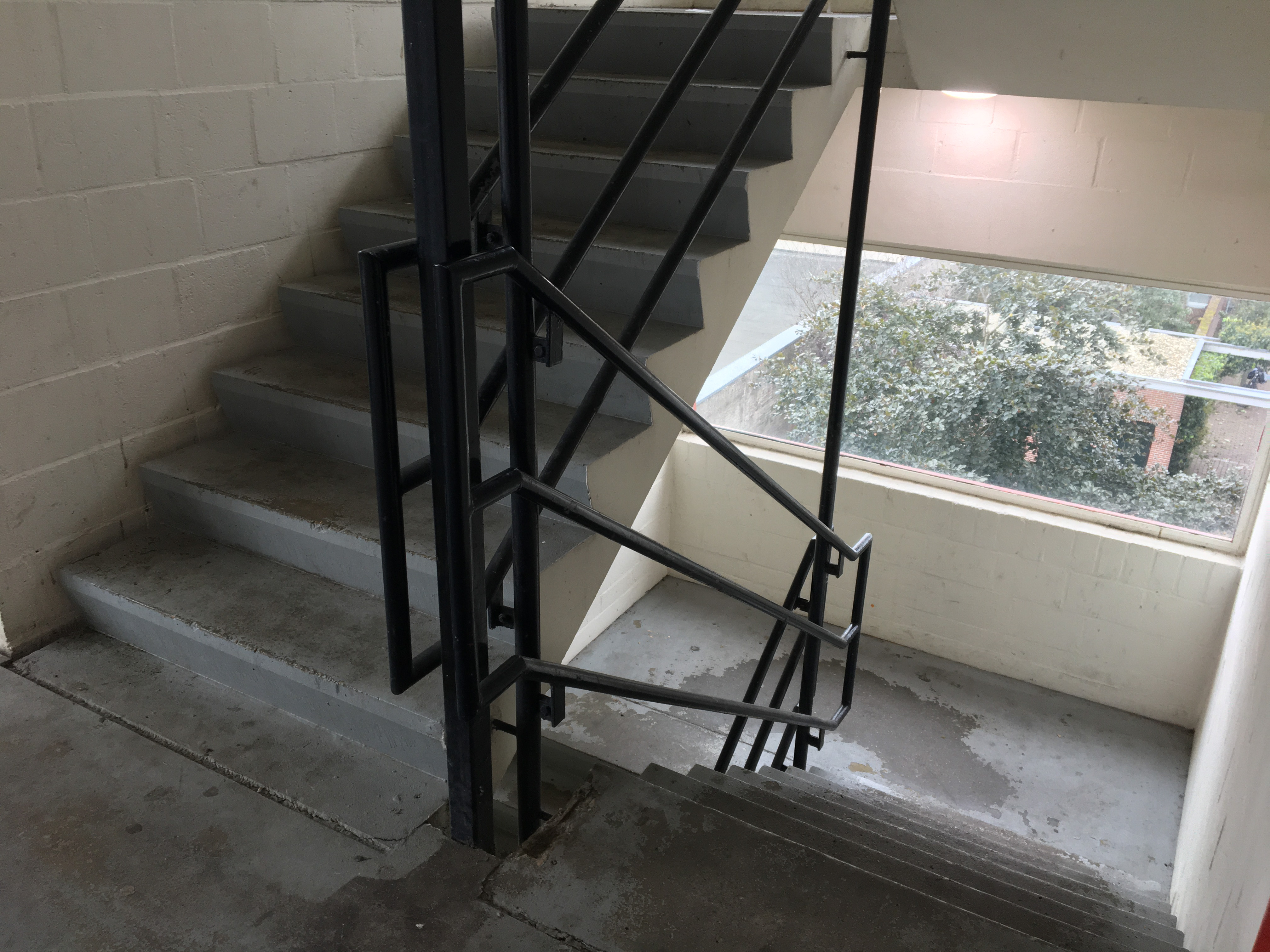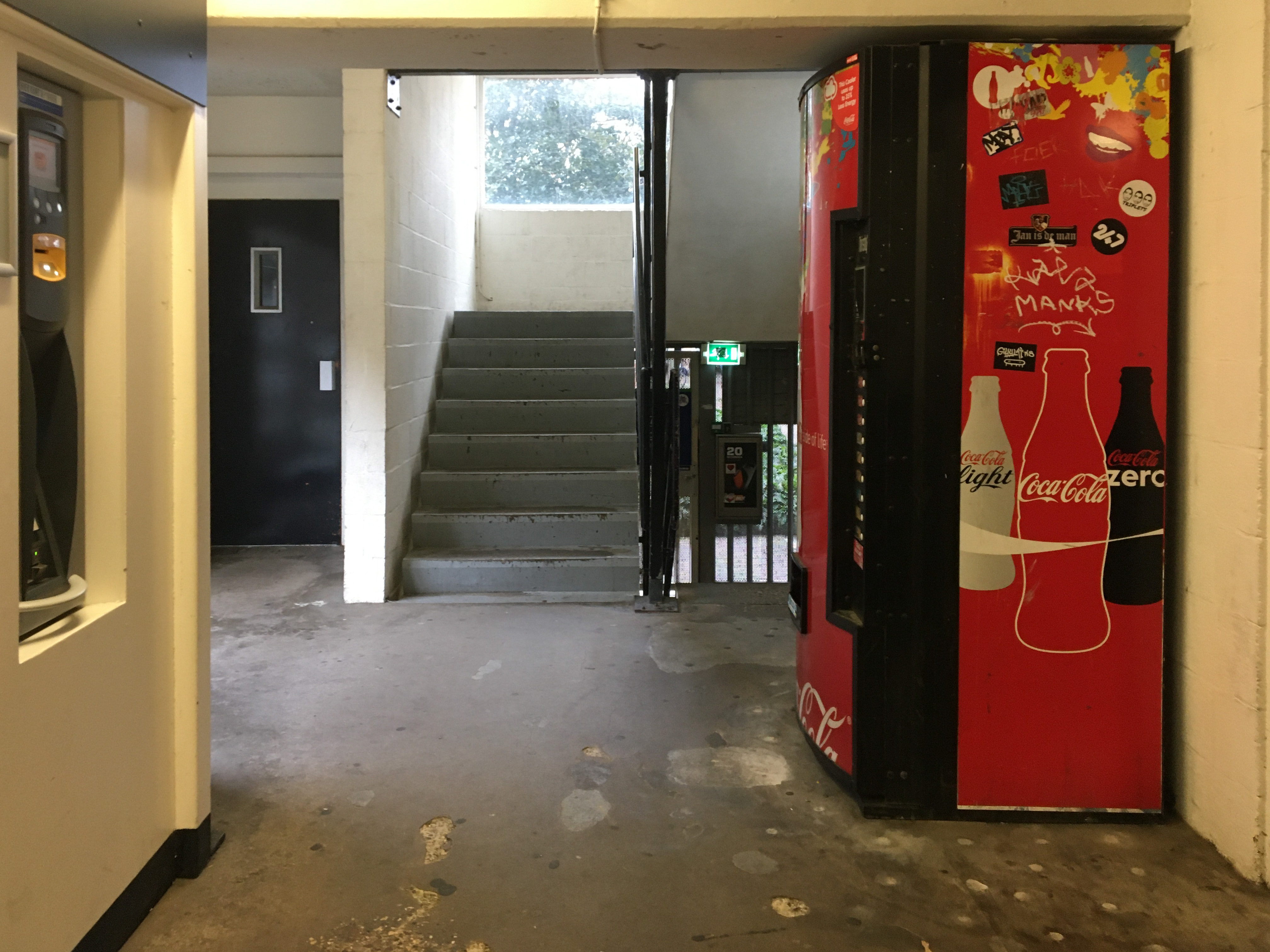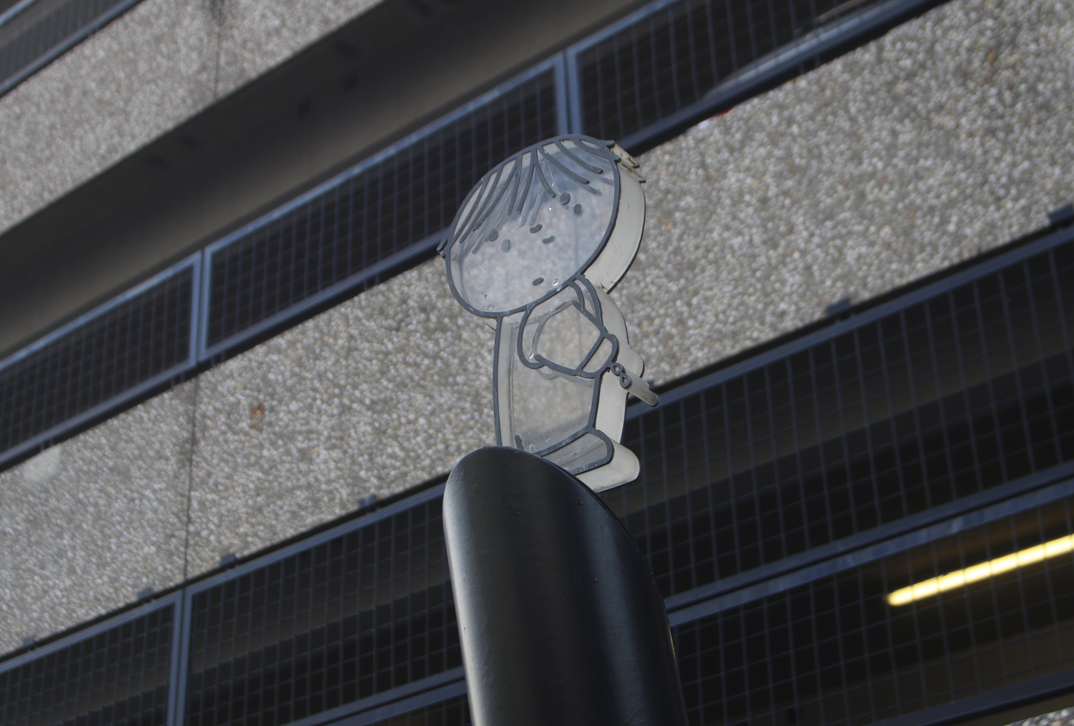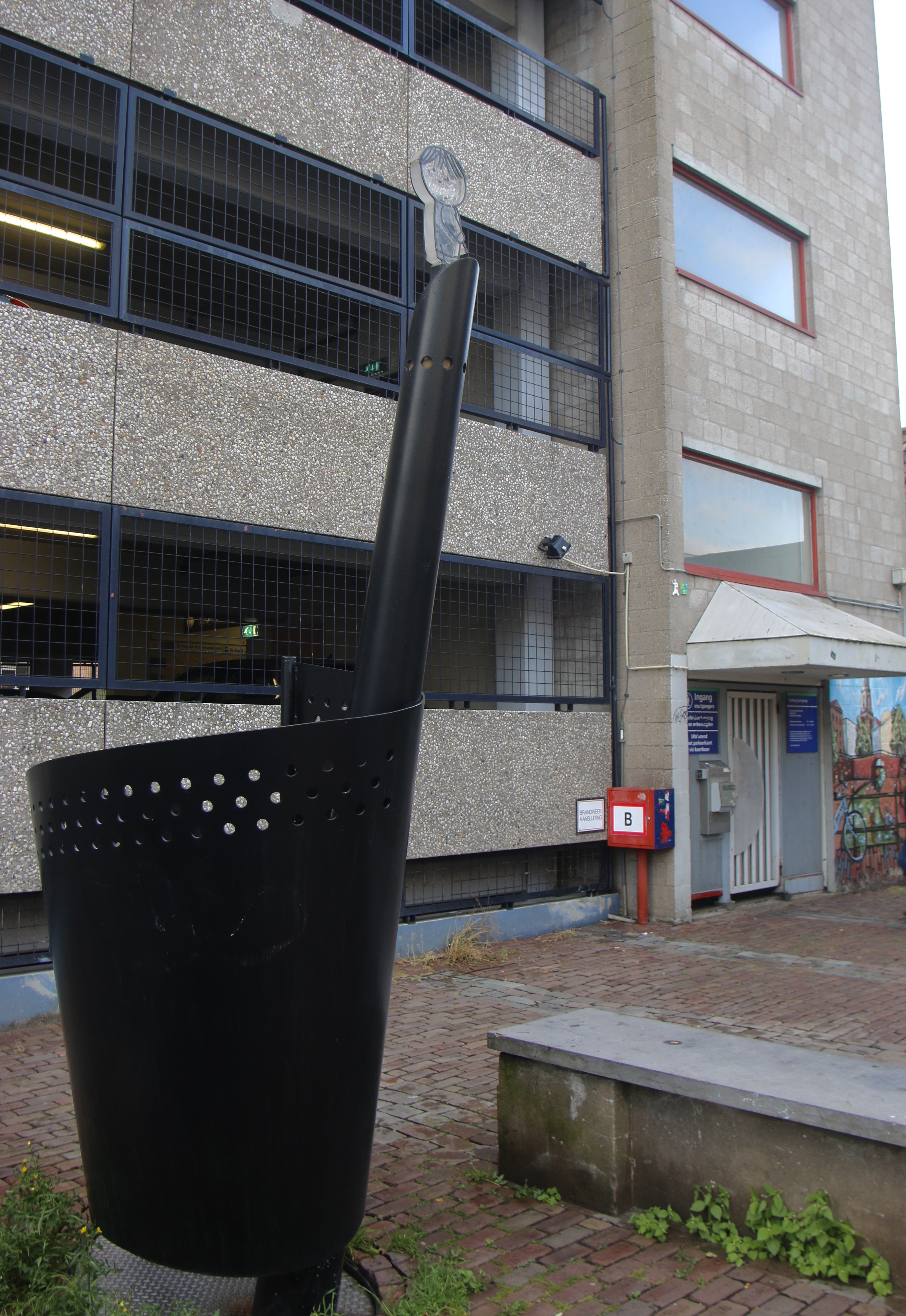 Dat uiterlijk is natuurlijk om van te smullen, maar de binnenkant is minstens even spannend. Een volkomen versleten maar nog in originele staat verkerend betonnen trappenhuis met verschoten vensters en een lift volgeplakt met graffiti der verdoemden. De plafonds hebben zelfgeknutselde buizen en bestaan nog grotendeels uit troosteloze synthetische riet-tegels. Misschien is het een idee om er op Culturele Zondagen een soort jaren ‘80 re-eneactment te organiseren door er een stel junks in te parkeren. In afwachting daarvan maakt de doordringende pislucht de beleving trouwens ook al behoorlijk compleet. Waarschijnlijk heeft die zo aanstekelijk gewerkt op bezoekers dat de gemeente een vrolijk Dick Bruna pisbakje bij de ingang neergezet heeft. Het beteuterd nadruppelende jongetje is waarschijnlijk een van de hoofdpersonen uit Nijntje in de par-keer-ga-ra-ge.