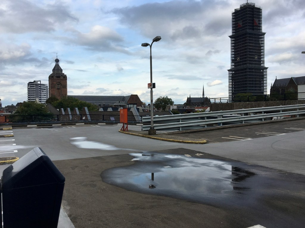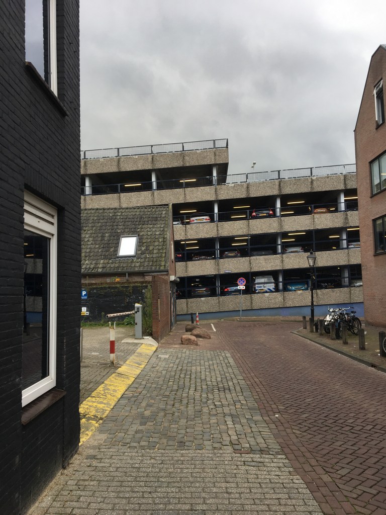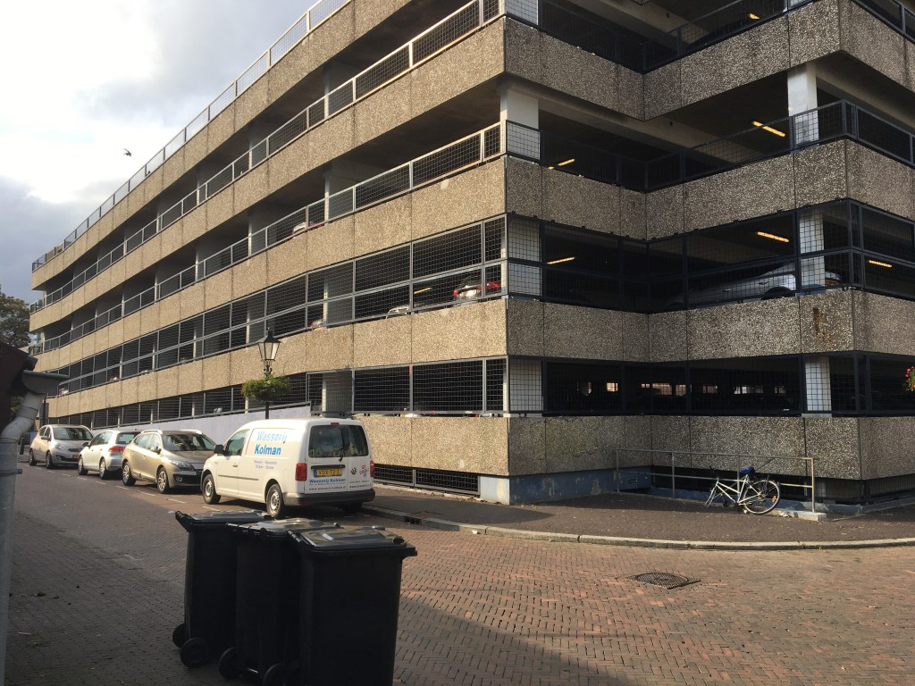Sloop in 2028. Intussen wordt er nagedacht over een tijdelijke herbestemming. „Een daktuin, een rooftopbar, ateliers, er kan vast wat’’, 1twittert een D66 raadslid1 . Ik verbind het woord twitteren altijd met gekwetter van naïeve vogeltjes en dat lijkt me hier weer prima bevestigd. Een parkeergarage is een tochtig betonskelet en is alleen geschikt voor auto’s, niet voor mensen. Zelfs niet voor kunstenaars. Ik verplaats me even in het werk- en denkniveau van het raadslid en suggereer een functie als trouwlocatie.