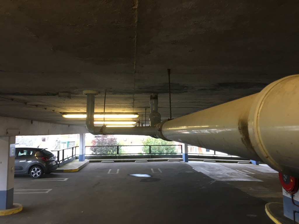Dante had Vergilius als metgezel op zijn tocht van de hel naar de berg der loutering. Wij moeten het blijkbaar met Dick Bruna doen. In deze simplistische omgeving is dat overigens best gepast. Klim je de haveloze trappen op dan wordt je op het dak beloond met een troosteloos panorama. Het vagevuur in optima forma! Grindbeton, eeuwig brandende TL-buizen, kapot asfalt en altijd wel een waterplas. Al die obsolete bouwmaterialen wachten geduldig op verlossing. Gelukkig komt die snel, want in 2028 wordt de garage gesloopt. Hij maakt waarschijnlijk plaats voor appartementen-zowel koop als huur.