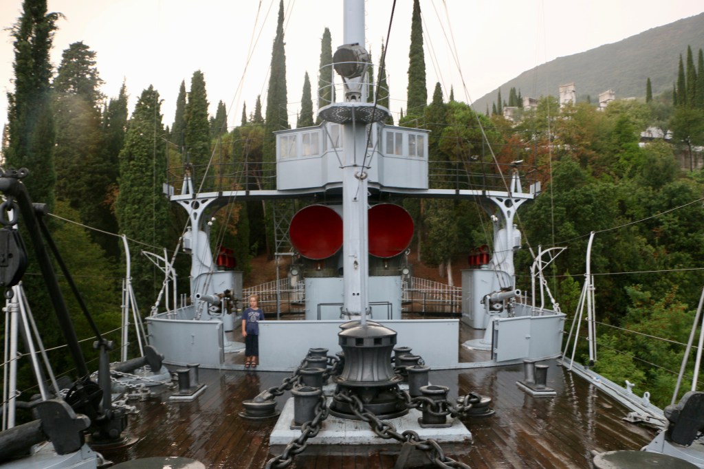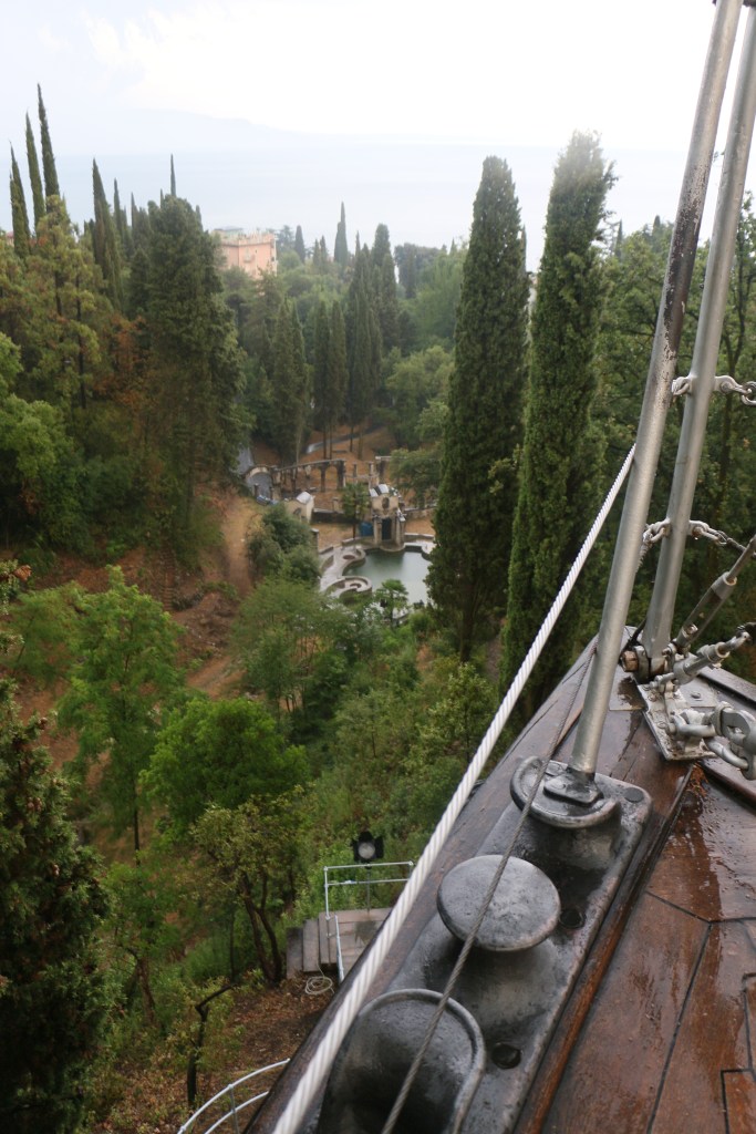 Het schip in de tuin. In brons D’Annunzio en een ronde versie van de Duce.