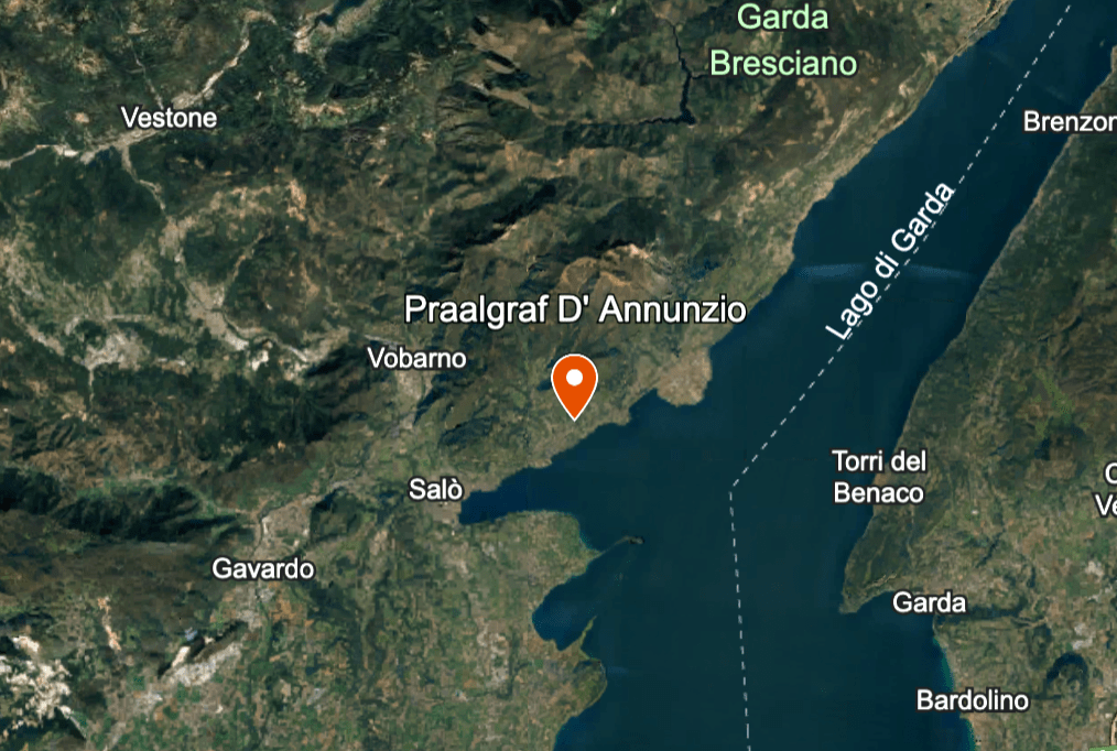 Bij leven liet D’Annunzio hij een enorme villa bouwen waar alle grote momenten uit zijn leven vereeuwigd werden. Dat waren er erg veel want hij leidde een avontuurlijk bestaan. Het fraaiste object is ongetwijfeld een bijna volledig oorlogsschip dat in zijn geheel de bergen in is gesjouwd en als een balkon in de tuin ligt.