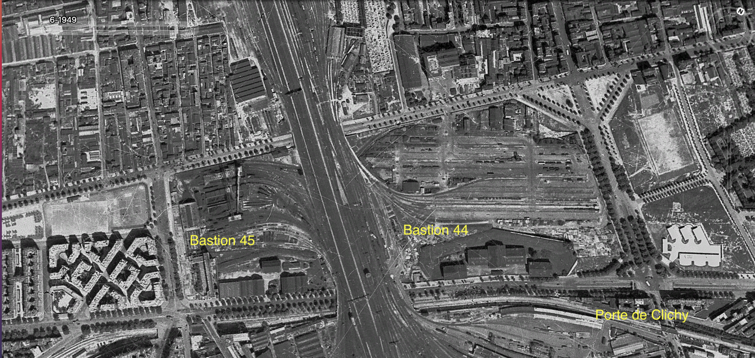 De muur van Thiers is vrijwel geheel verdwenen. Naast de namen van de poorten als evenzovele afritten van de Périphérique zijn er maar een paar restjes overgebleven. Deze foto toont 2 resterende bastions bij porte Clichy aan weerszijden van de spoorweg naar gare du Nord. Ze laten zien hoe de muren werden vervangen door complexen van de meerlagige arbeiderswoningen die geheel links direct aansluiten. Let ook op de arbeiderswijken ten noorden waarvan de leefomstandigheden nauwlijks afweken van die in de zone.