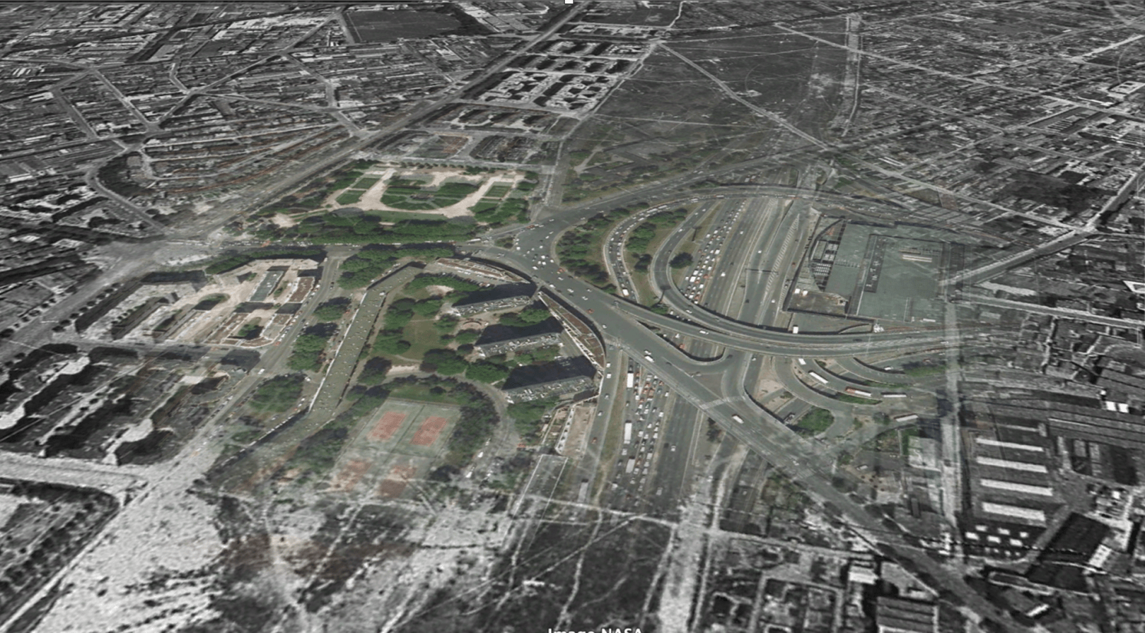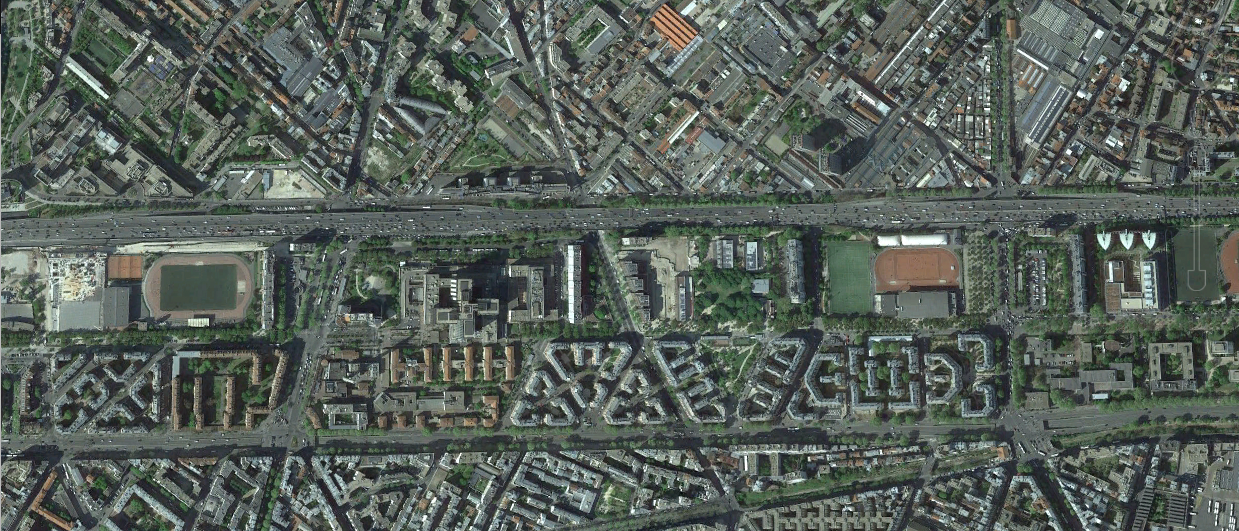 En wat moet je met zo’n ringvormige stuk wasteland binnen je stad? In de jaren ’50 waren ze eruit: Er zou een ringweg om Parijs worden aangelegd om het sterk groeiende verkeer alle plaats te bieden: de boulevard Périphérique! Wat er nog aan zone over was werd volgebouwd met flats, kantoren sportvelden en af en toe een parkje.