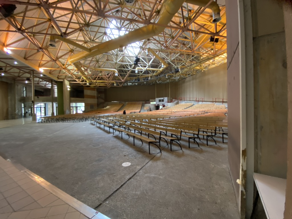 Tijd voor een bezichtiging dus. We beginnen op het plein. De halfronde vorm beeldt natuurlijk een omarming uit. Een wat ongelukkige ode aan een bedrijfsgebonden gebruik dat toch wel voor de nodige schandalen heeft gezorgd… Ook het feit dat het interieur enigszins aan een verlaten sporthal doet denken maakt het er allemaal niet beter op. Alleen een Amerikaans aandoend altaar en een bovenmaats orgel zorgen voor een wat meer traditionele elementen die duidelijk dat we hier met een kerk te doen hebben. Desondanks zijn de kale trappen en de stukjes noppenvloer zo dominant aanwezig dat de associatie met een lager wal geraakt congrescentrum zich steeds duidelijker opdringt. Wie verder zoekt vindt beslist foto van de werknemer van de maand.