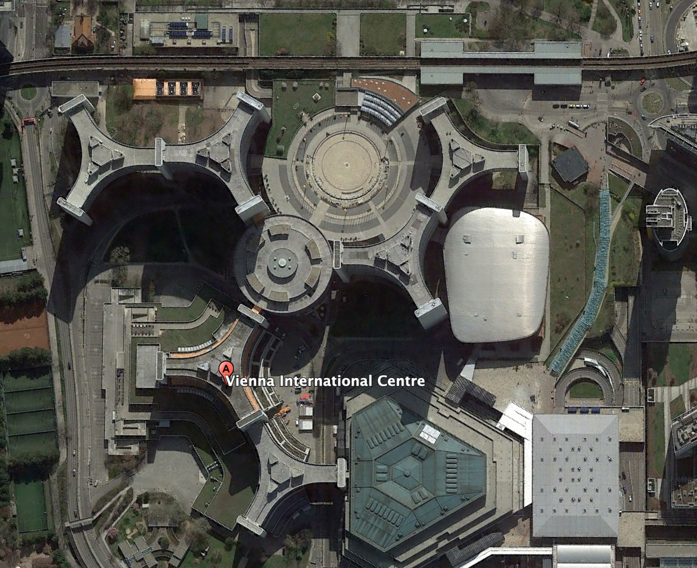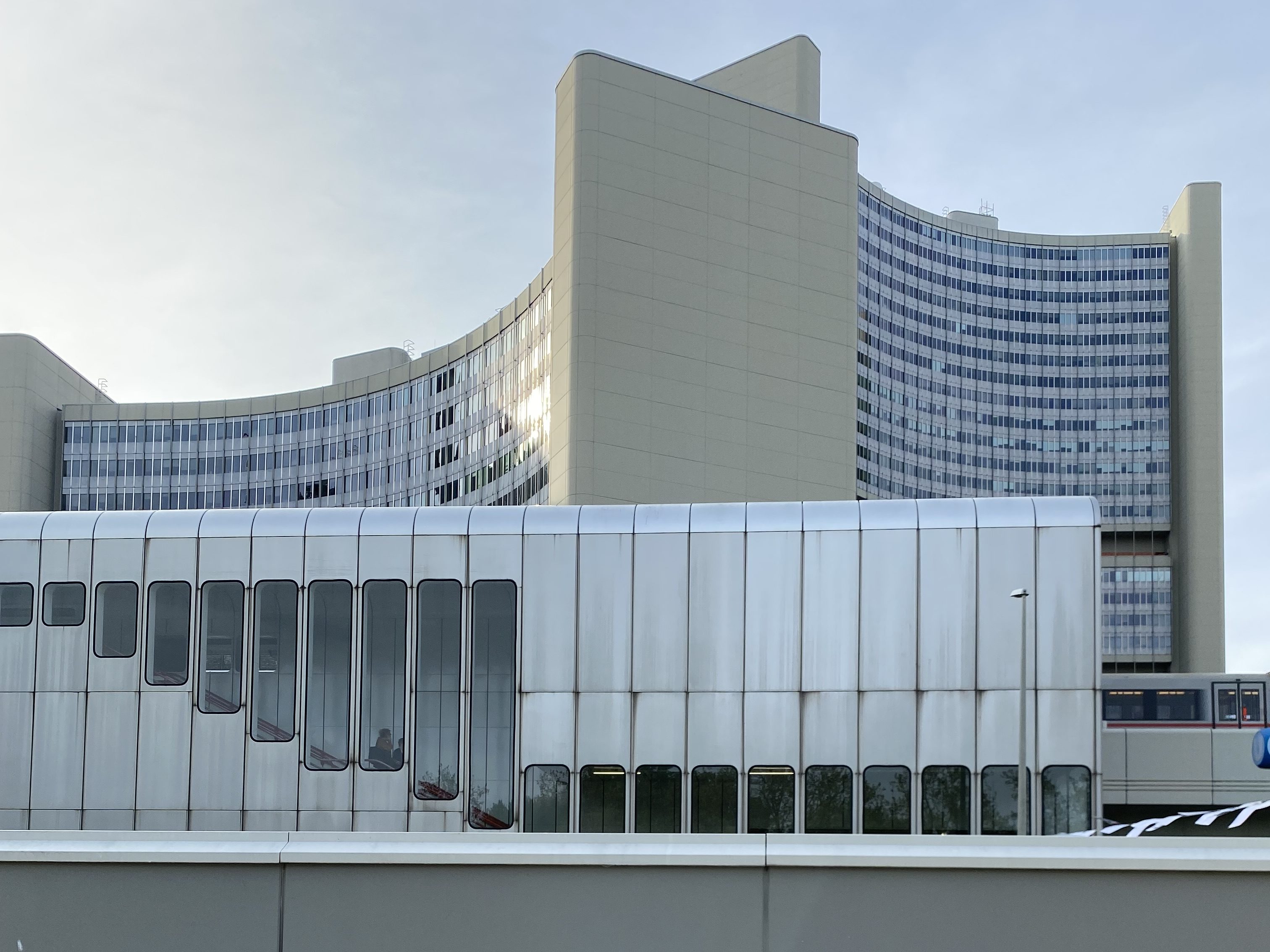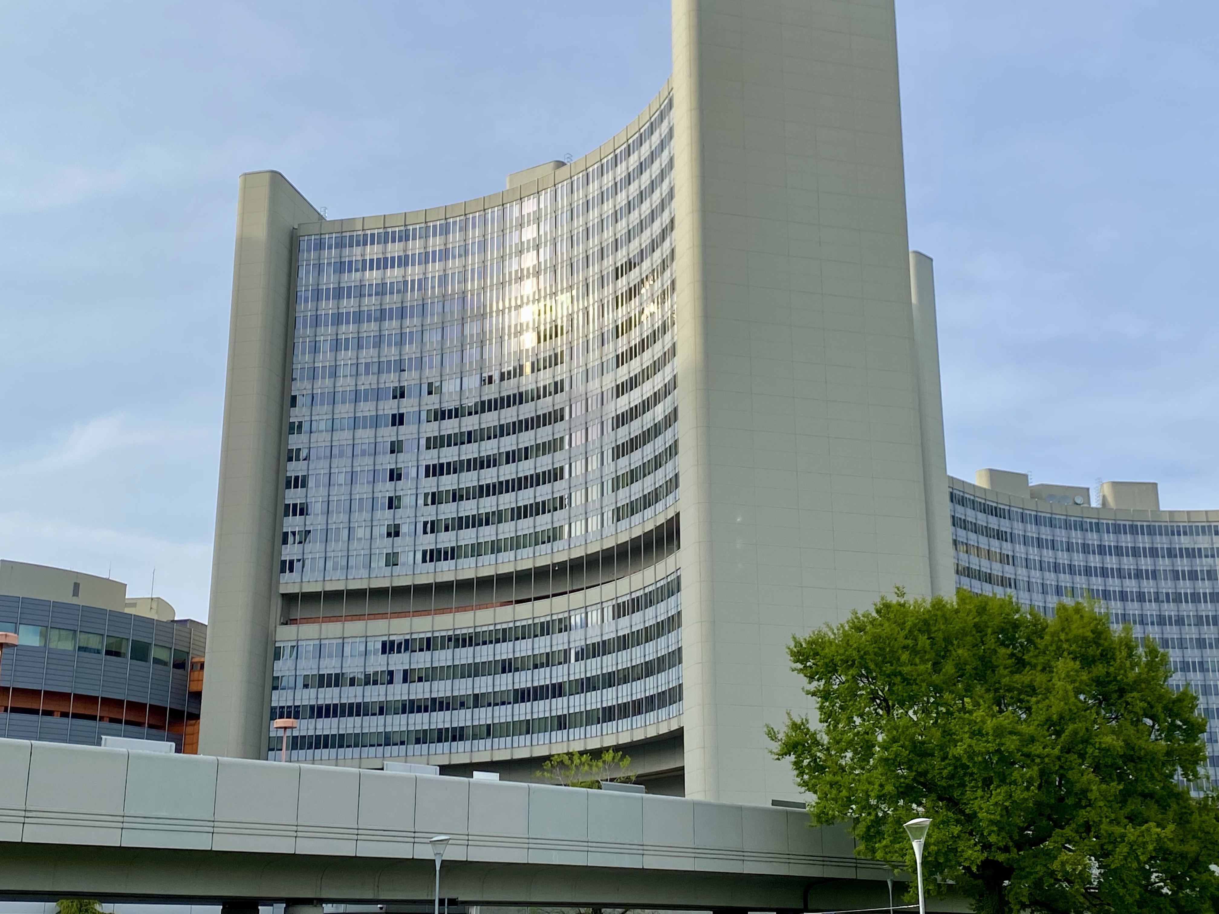 UNO City -ook Vienna International Centre (VIC) genoemd werd ontworpen door de Oostenrijkse architect Johann Staber (1928-2005). De bouw duurde van 1973 tot 1979. De Y-vormige torens zijn tussen de 48 en 120 meter hoog en bevatten zo’n 4500 kantoren, 9 conferentiecentra en nog een aantal andere voorzieningen. Er werken tussen de 3-en 4000 mensen. Ook praktisch opgeleiden waarschijnlijk, want het geheel is prima onderhouden en maakt, anders dan veel complexen uit de jaren ’70 een uitermate frisse indruk. Het heeft een extraterritoriale status en is samen met Genève en Nairobi een van de deelkantoren naast de hoofdvestiging in New York.
