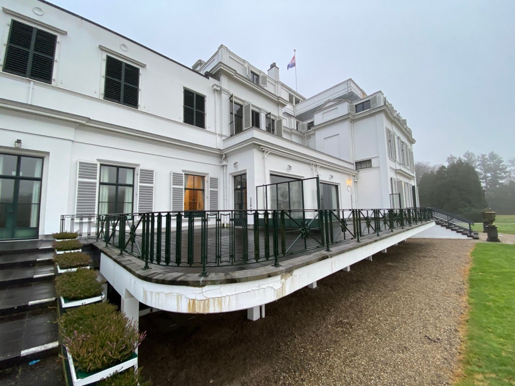 Het paleis ziet er vanuit die tuin een beetje uit als een studentenhuis. Er zijn op eigen gezag allerlei aanbouwen verschenen die het een rommelige indruk geven. Ramen zijn vervangen door doorzon-vensters met rolluiken waarachter je een flets behang kunt zien. Een houten opbouw met lelijke plafondverlichting doet denken aan een slecht onderhouden kantoor uit de jaren ‘70. Ik gok dat het versleten laagpolige tapijt oranje is. Klap op de vuurpijl zijn de enorme balkons die aan de Baarn-vleugel zijn geplaatst. Hun beton vertoont barsten en ze doen denken aan de terrassen van goedkope toeristenrestaurants in zuidelijke landen. In makelaarsjargon zou het object waarschijnlijk als ‘avontuurlijk’ worden gelabeld.