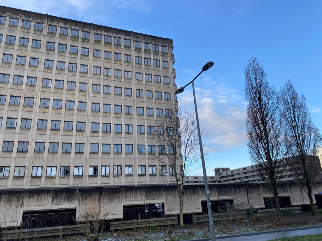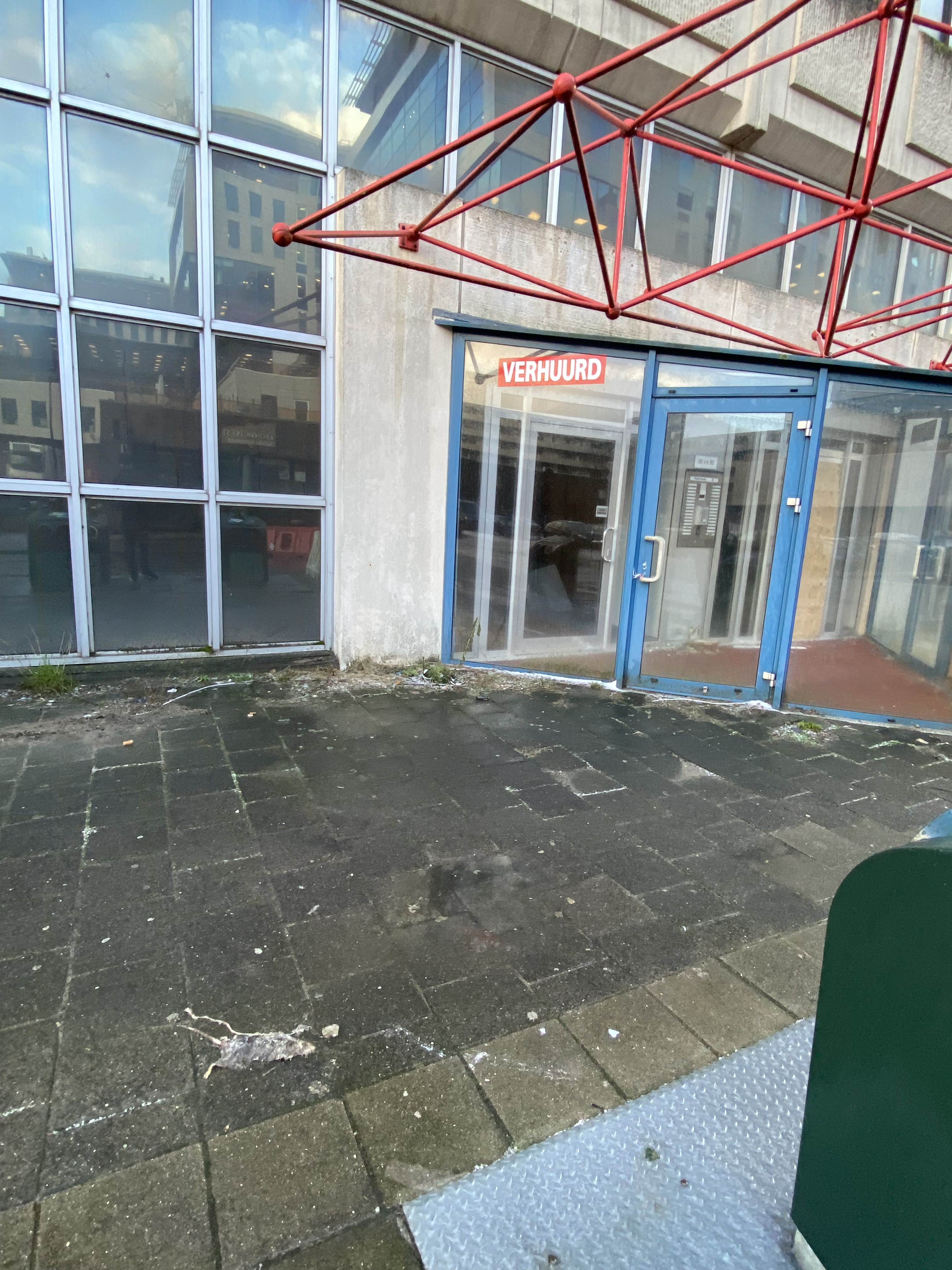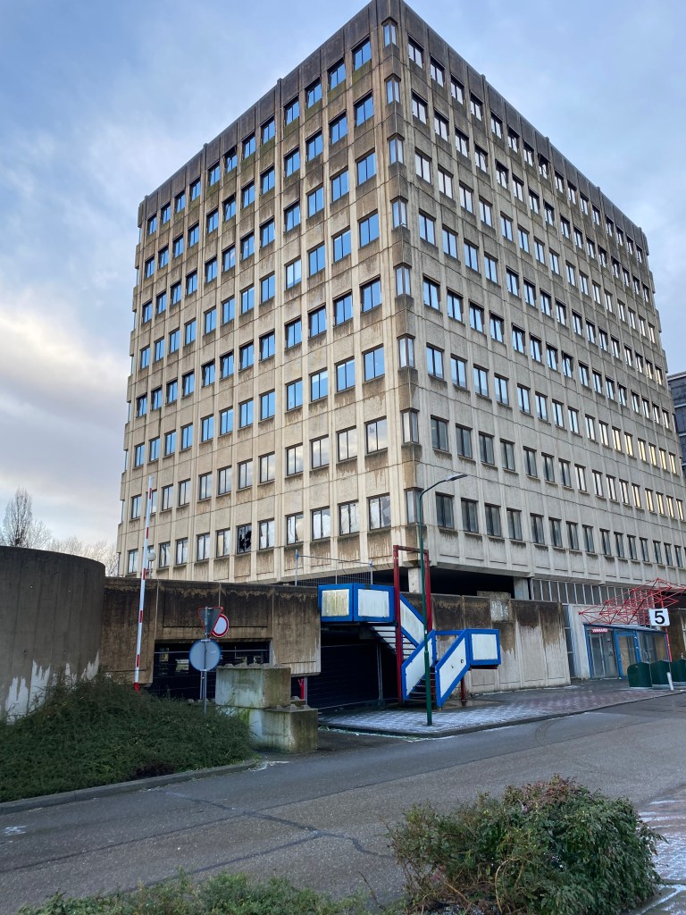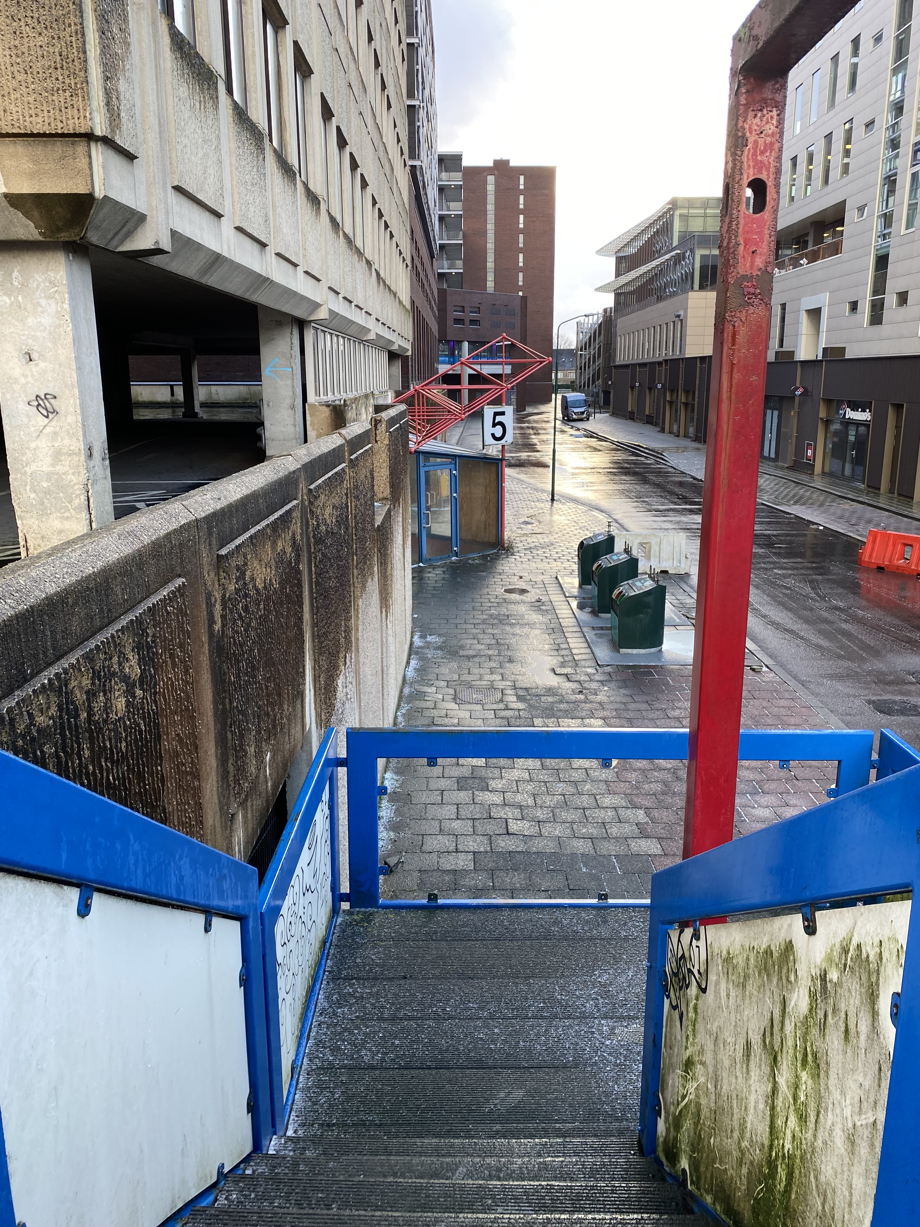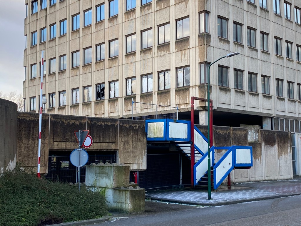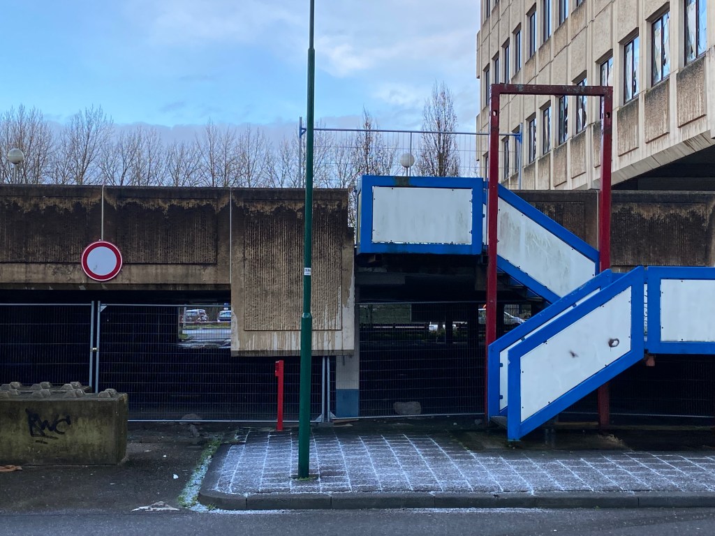 Naast de met ruwe betonplaten gemarkeerde ingang naar de onderwereld staat een gekleurde constructie die wel wat weg heeft van een defecte guillotine. Als je ontdekt dat dit een trap naar het bovenste parkeerdek is wordt de moeite ruimschoots beloond met een prachtige blik op het klapstuk: de leegstaande kantoortoren. De gebroken vensters in de brutalistische betonelementen verraden dat hij zijn langste tijd gehad heeft. De ooit met stalen-buizen-kunst opgefleurde ingang geeft optimistisch aan dat het geheel verhuurd is. Een forse platgetrapte rat pal voor die entree geeft een wat realistischer beeld van de situatie.