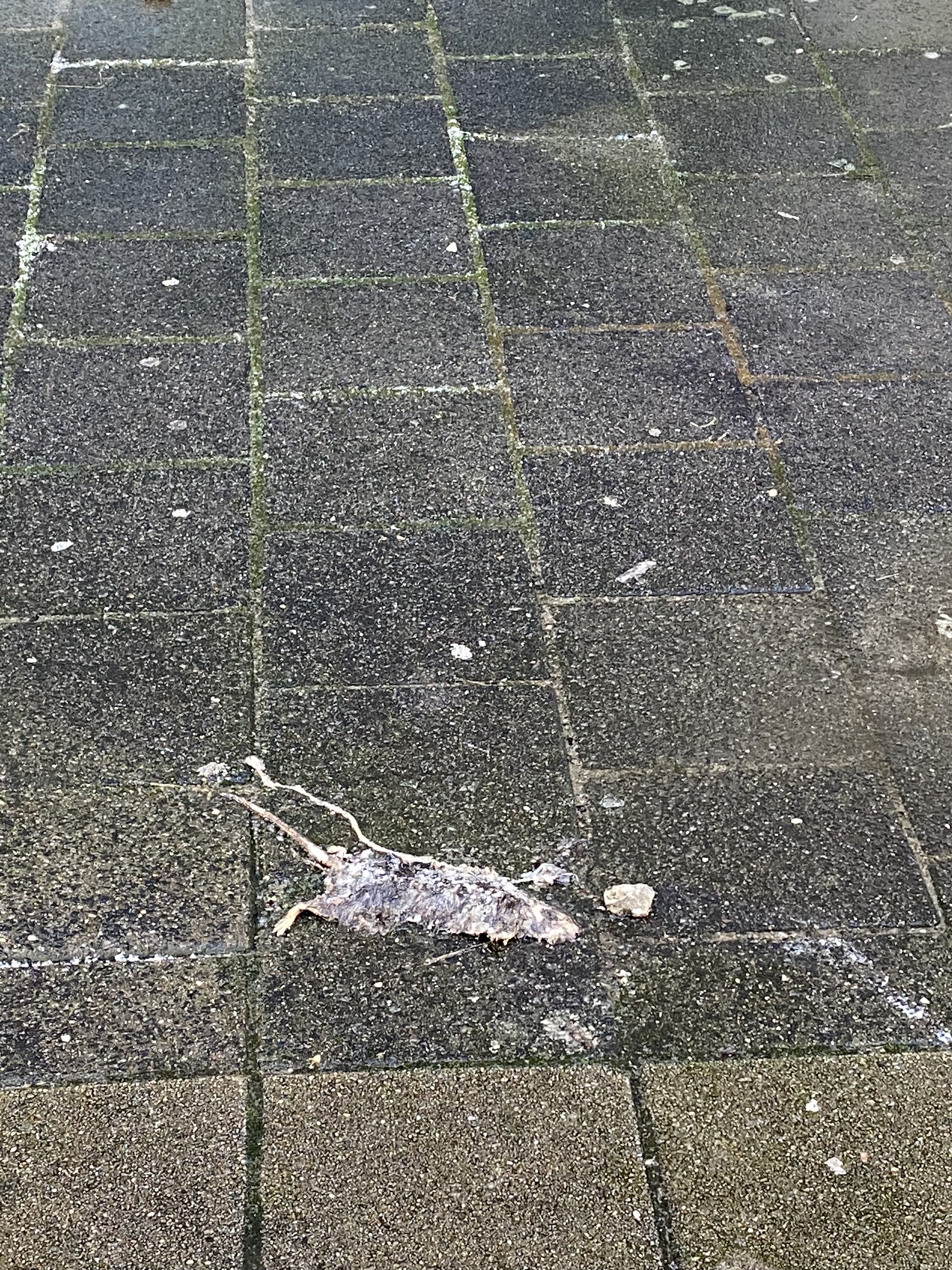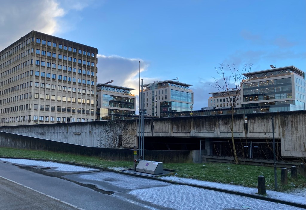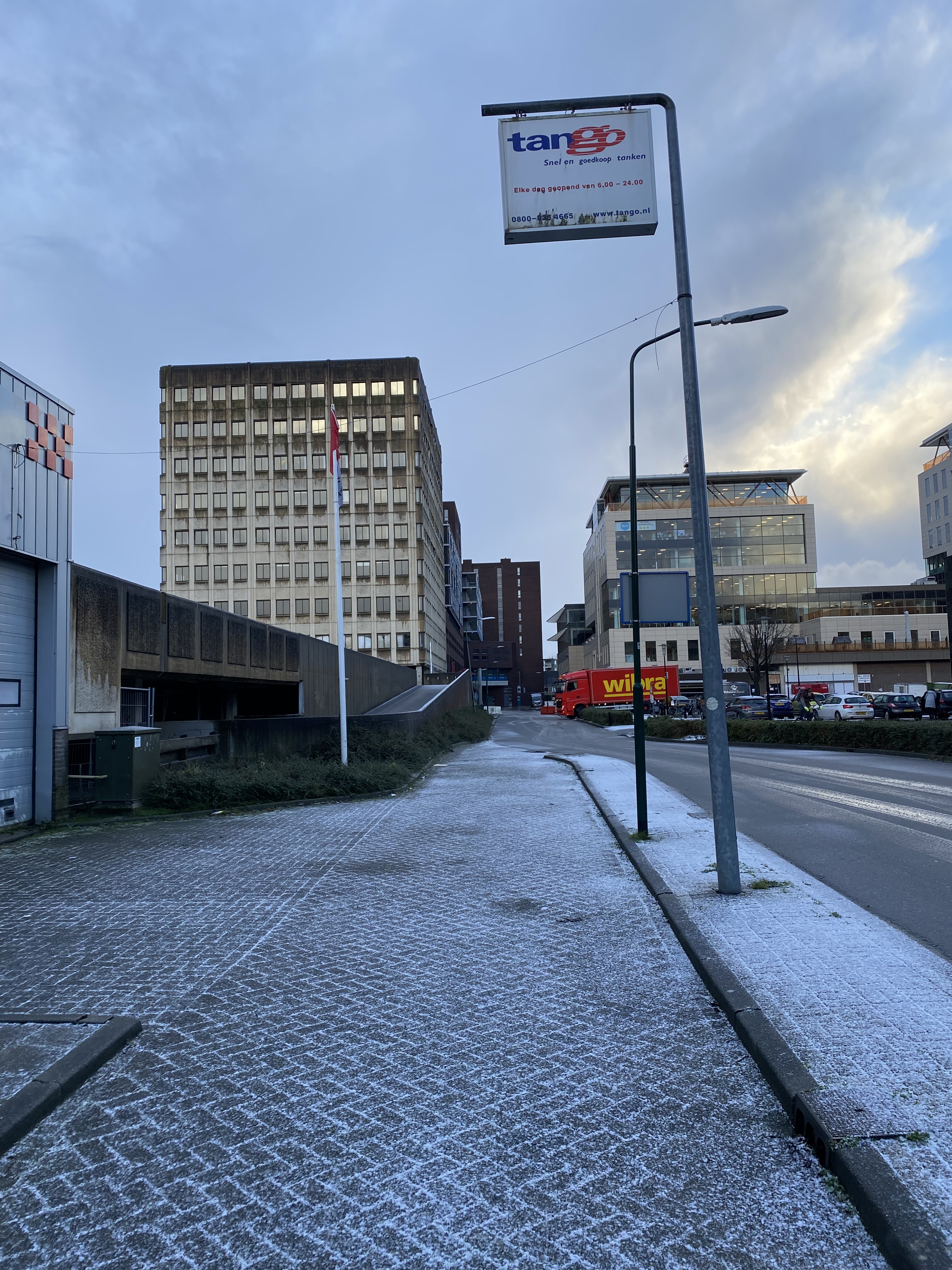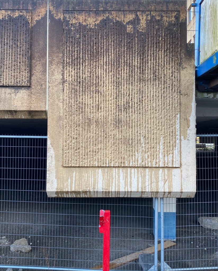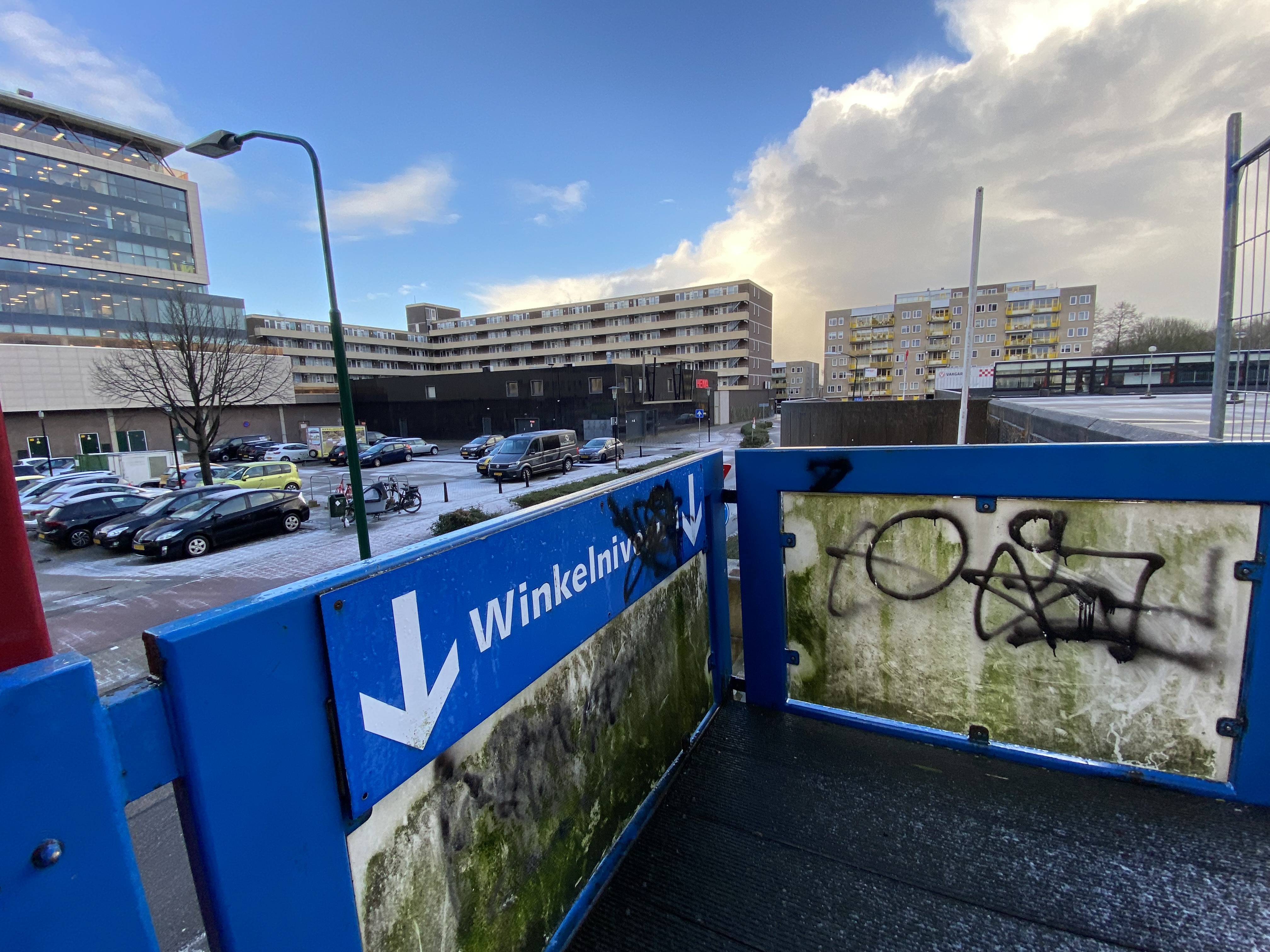 Naast de met ruwe betonplaten gemarkeerde ingang naar de onderwereld staat een gekleurde constructie die wel wat weg heeft van een defecte guillotine. Als je ontdekt dat dit een trap naar het bovenste parkeerdek is wordt de moeite ruimschoots beloond met een prachtige blik op het klapstuk: de leegstaande kantoortoren. De gebroken vensters in de brutalistische betonelementen verraden dat hij zijn langste tijd gehad heeft. De ooit met stalen-buizen-kunst opgefleurde ingang geeft optimistisch aan dat het geheel verhuurd is. Een forse platgetrapte rat pal voor die entree geeft een wat realistischer beeld van de situatie.