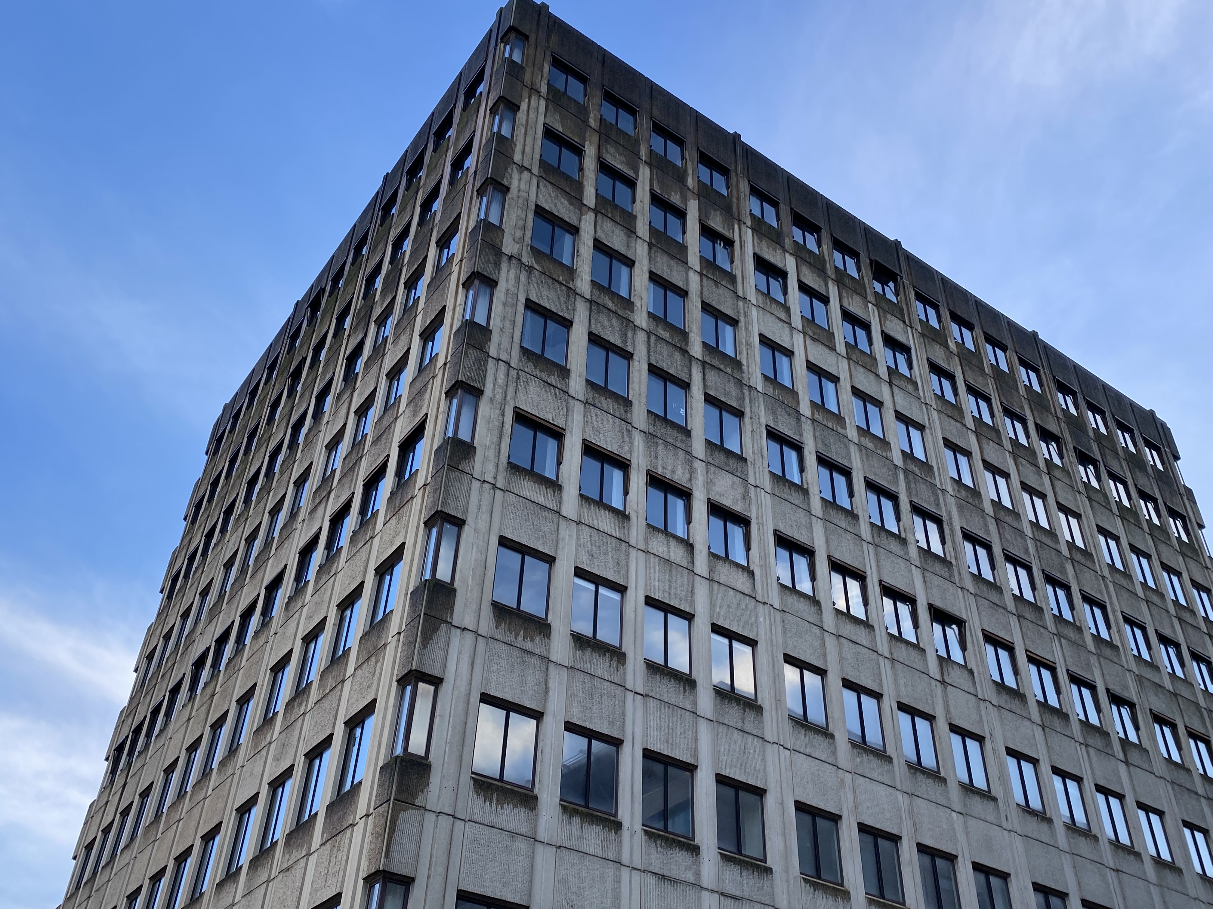 De beste beleving krijg je door met de trein te arriveren. Vanaf het perron ontvouwt zich een weergaloos panorama op de historische skyline. Optisch gekaderd tussen het bemoste perspex dak van het station en een vakkundig volgekliederde wand staat een betonnen kantoortoren uitnodigend te wachten op een bezoekje.
