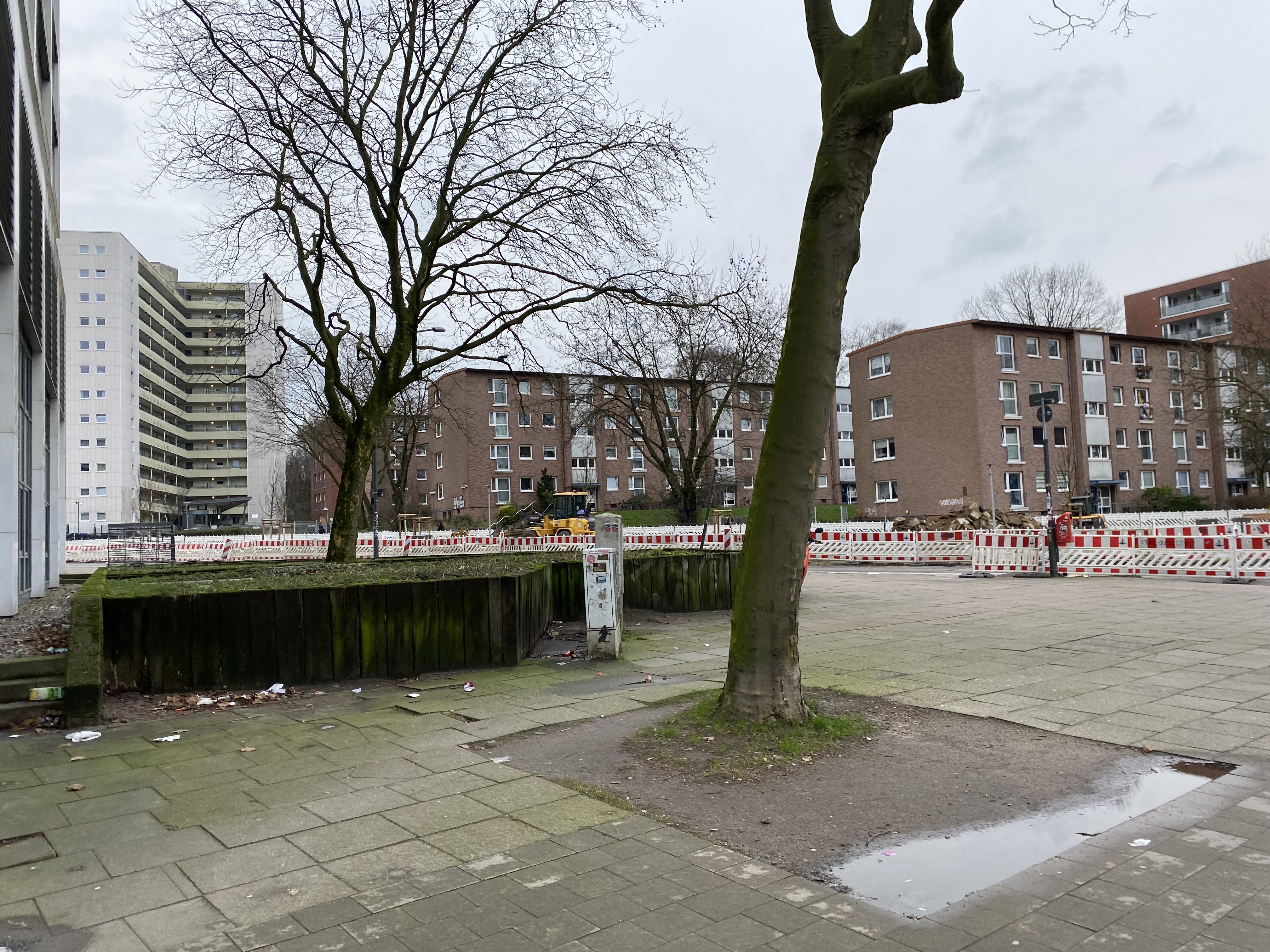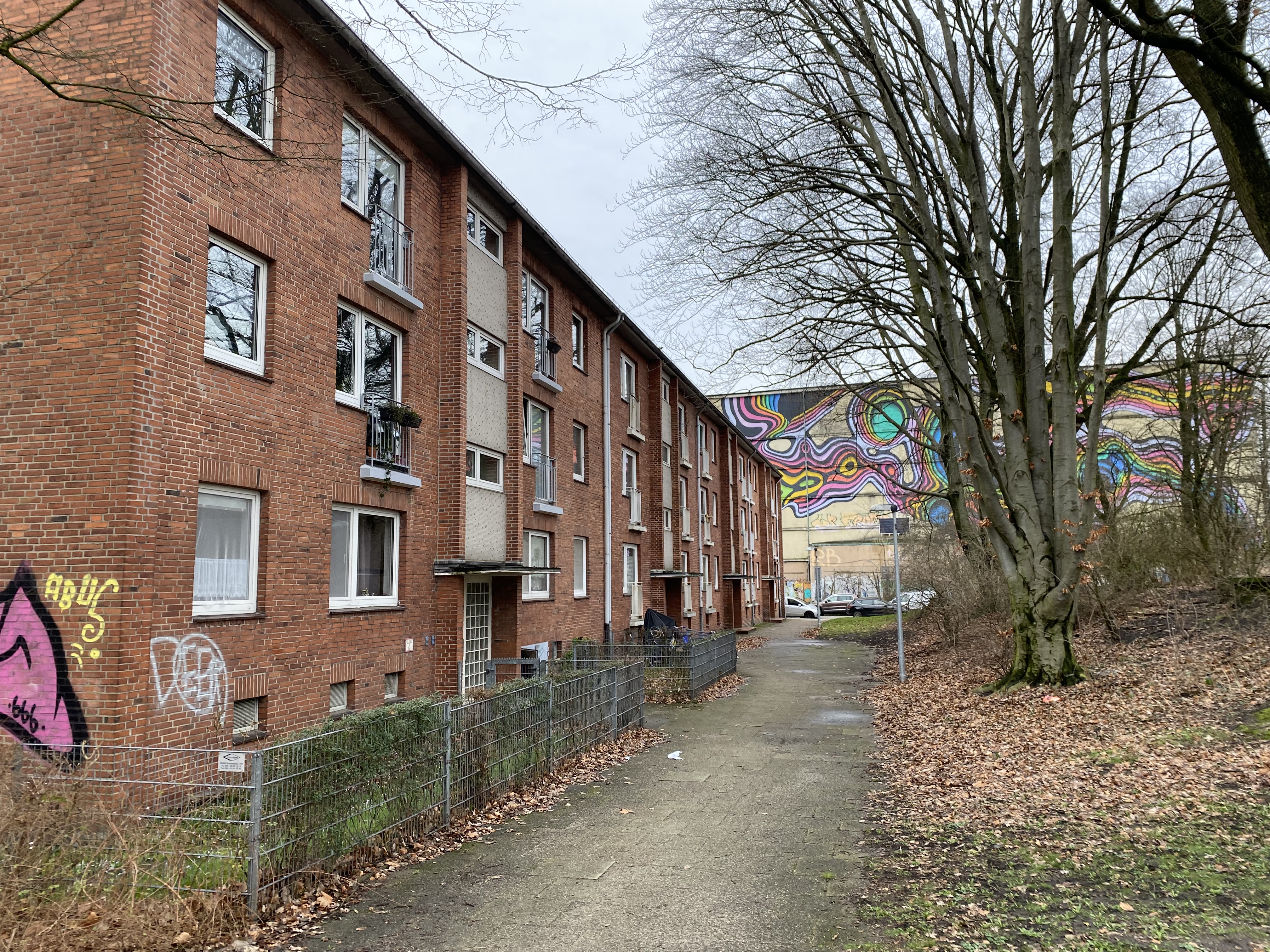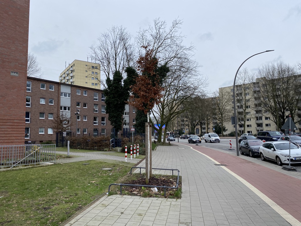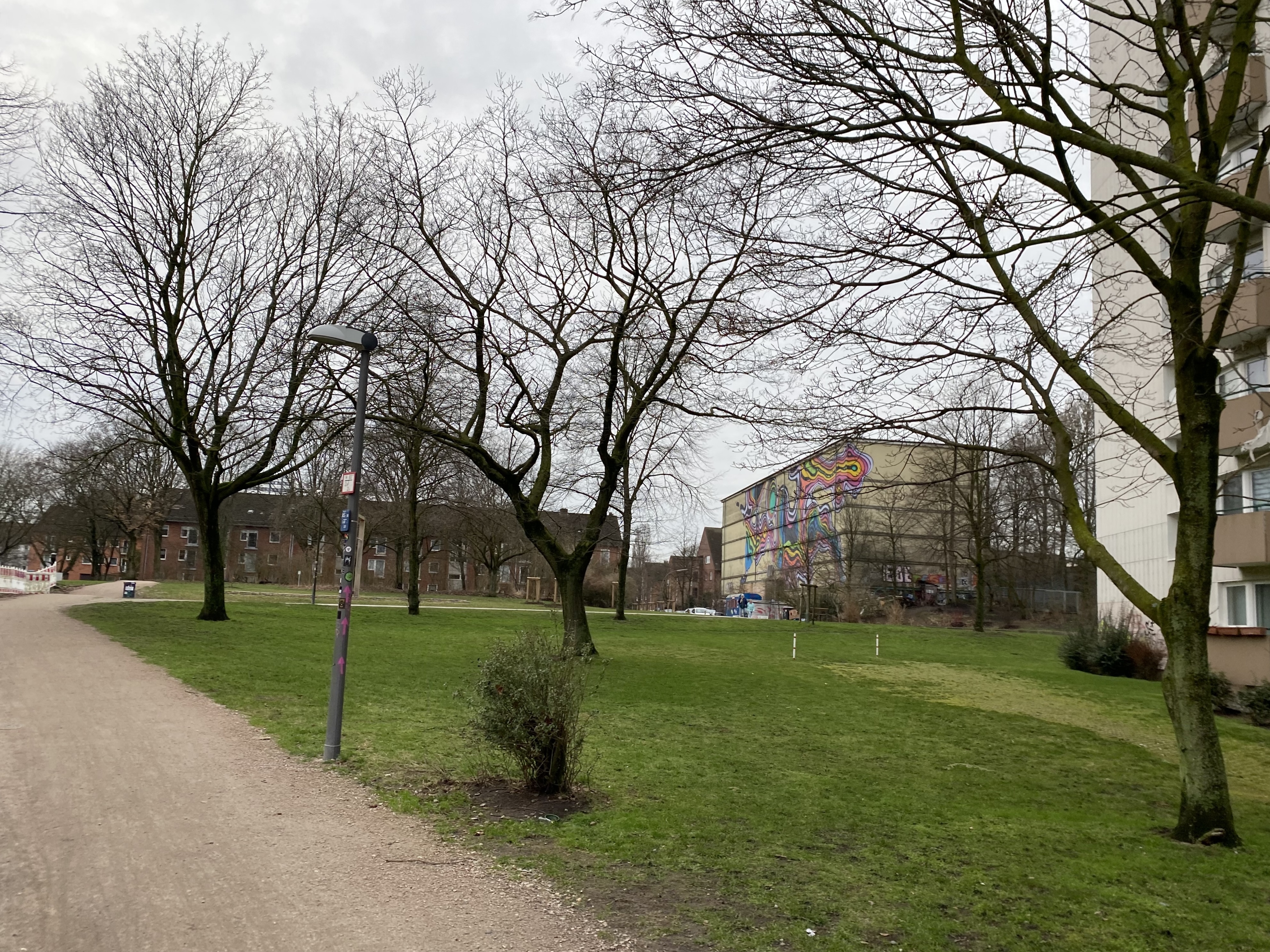 Ze staan in een enorm liefdeloos aangelegd grasveld met wat bomen en struiken. Dit is het Walter-Möller Park, de weldadige groenstrook die die moest dienen voor recreatie van jong en oud. Merkwaardig detail is dat een groot deel daarvan wordt gevormd door een kerkhof. Ook verder is het is er alarmerend stil. De brede snelweg (Holstenstrasse-zie footer van dit artikel) die het geheel doorsnijdt wordt omzoomd door naargeestige strokenbouw van 3 of meer verdiepingen. Die zee van eentonigheid wordt afgewisseld met enorme flats die het als accenten structuur geven. Aan hun voet liggen wat halfverlaten gebouwtjes die ooit als winkels waren bedoeld. De enige afwijkende bebouwing bestaat uit een macabere schuilbunker. Samenvattend lijkt de beoogde cultuurhistorische functie van dit bejubelde Freiraum wat teleurstellend.
