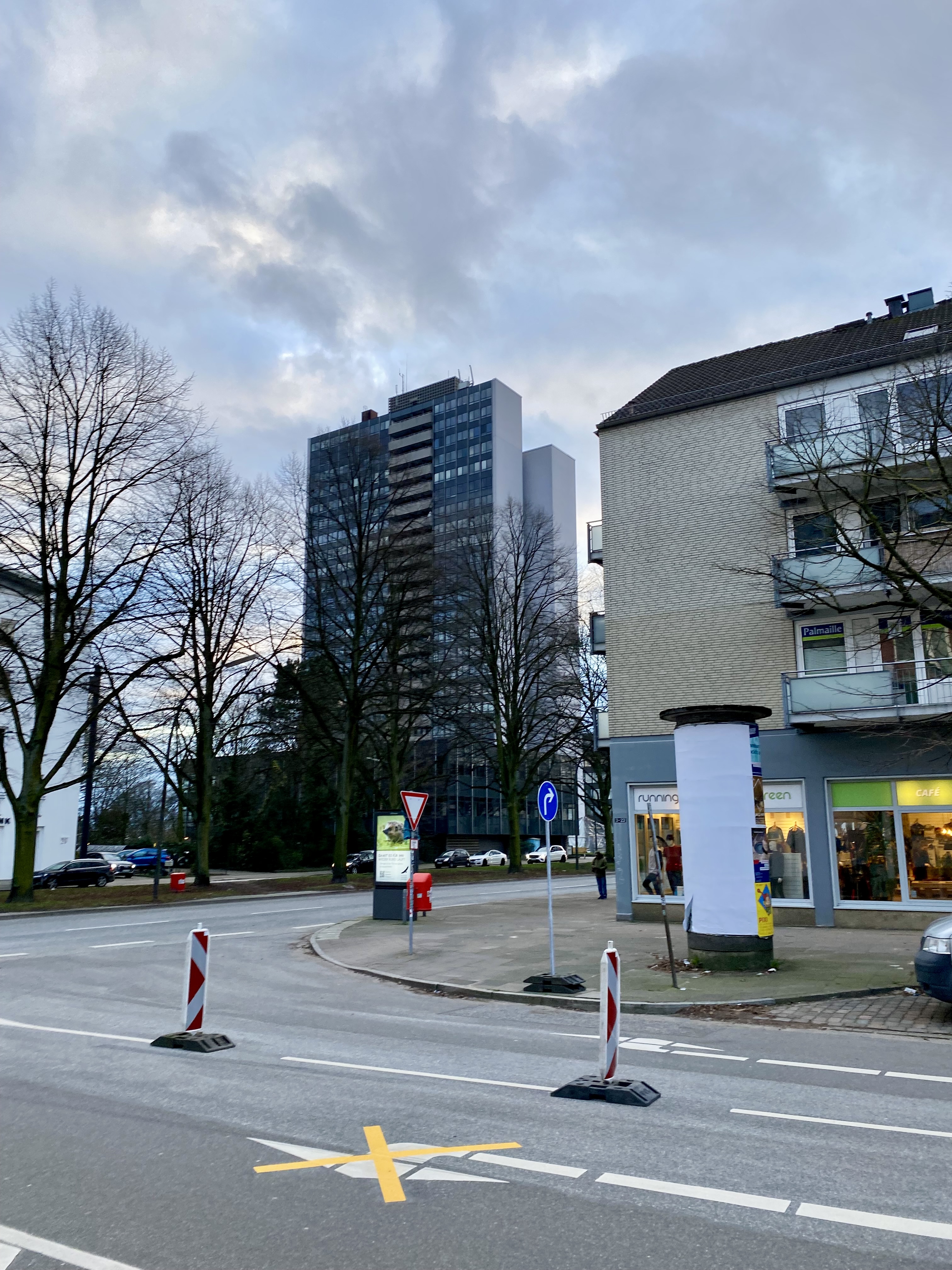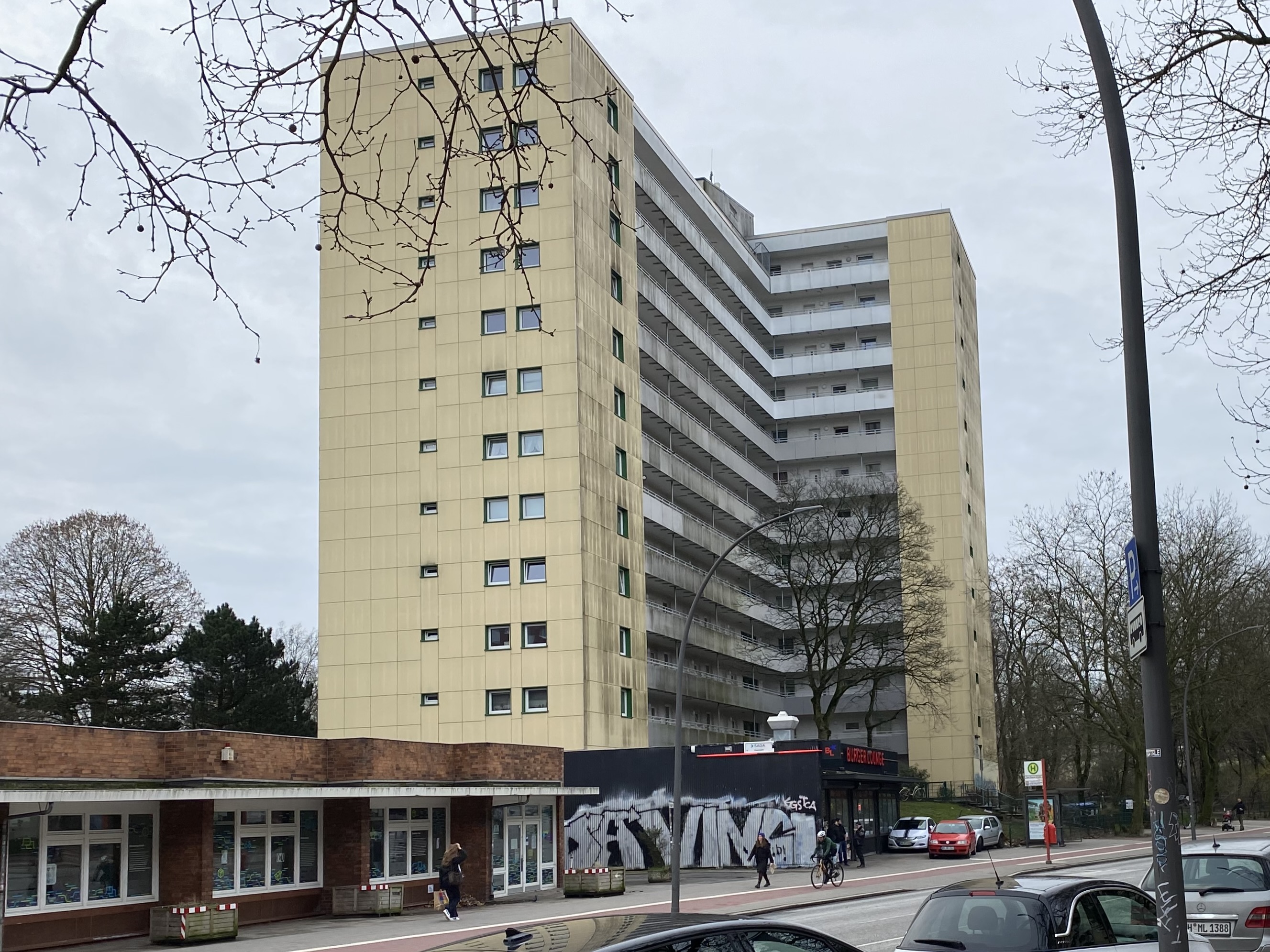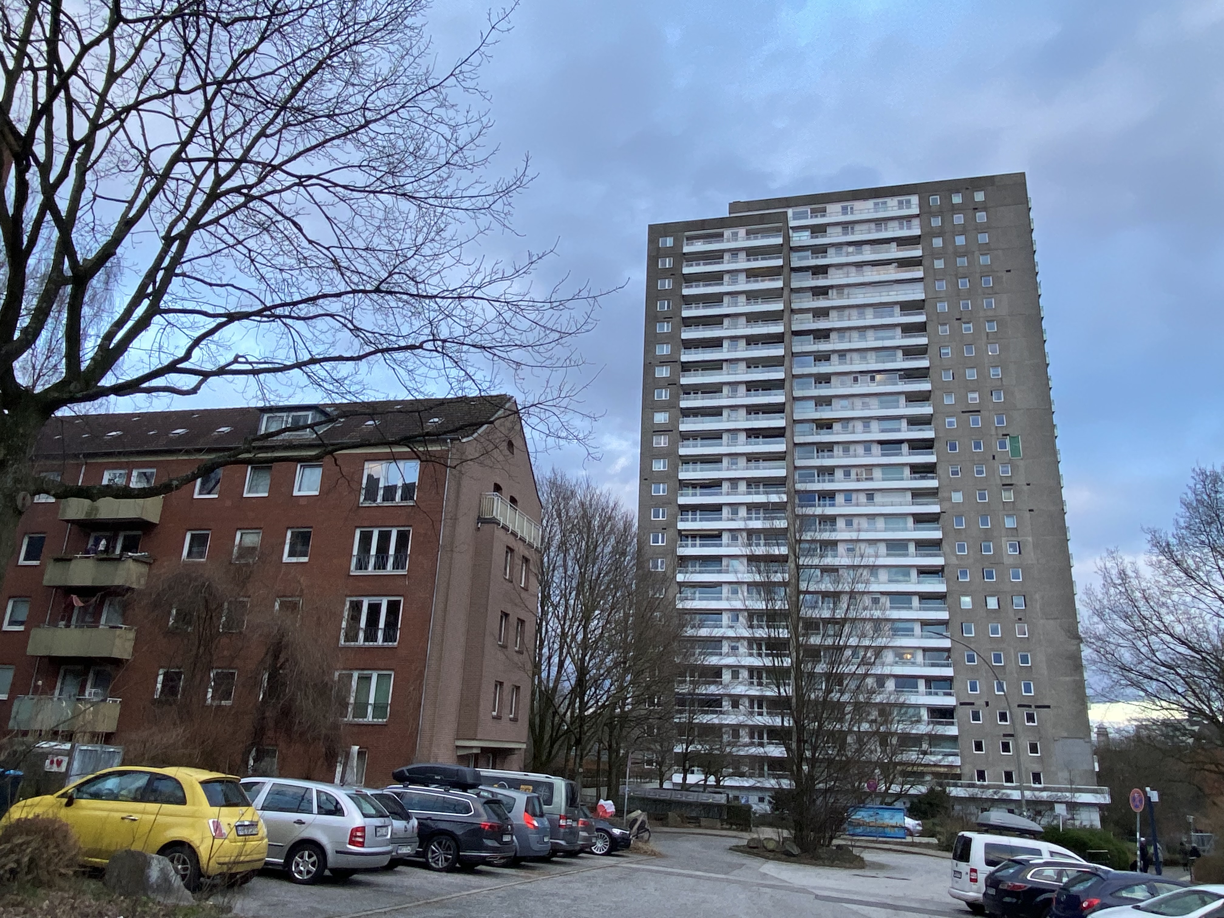 Ze staan in een enorm liefdeloos aangelegd grasveld met wat bomen en struiken. Dit is het Walter-Möller Park, de weldadige groenstrook die die moest dienen voor recreatie van jong en oud. Merkwaardig detail is dat een groot deel daarvan wordt gevormd door een kerkhof. Ook verder is het is er alarmerend stil. De brede snelweg (Holstenstrasse-zie footer van dit artikel) die het geheel doorsnijdt wordt omzoomd door naargeestige strokenbouw van 3 of meer verdiepingen. Die zee van eentonigheid wordt afgewisseld met enorme flats die het als accenten structuur geven. Aan hun voet liggen wat halfverlaten gebouwtjes die ooit als winkels waren bedoeld. De enige afwijkende bebouwing bestaat uit een macabere schuilbunker. Samenvattend lijkt de beoogde cultuurhistorische functie van dit bejubelde Freiraum wat teleurstellend.