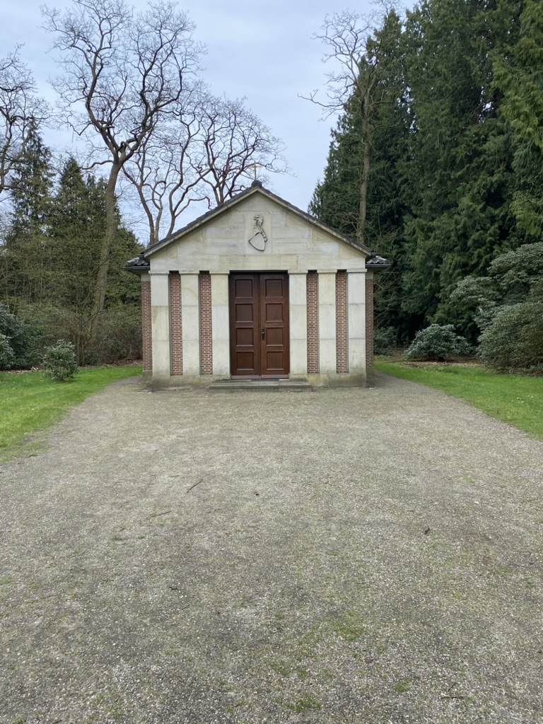 Mausoleum van Wilhelm. De vier tegels links zijn grafplaten voor zijn honden. Rechts: Wilhelms kist met Pruisische vlag. Waarschijnlijk de laatste plek waar deze vlag in het wild te zien is.