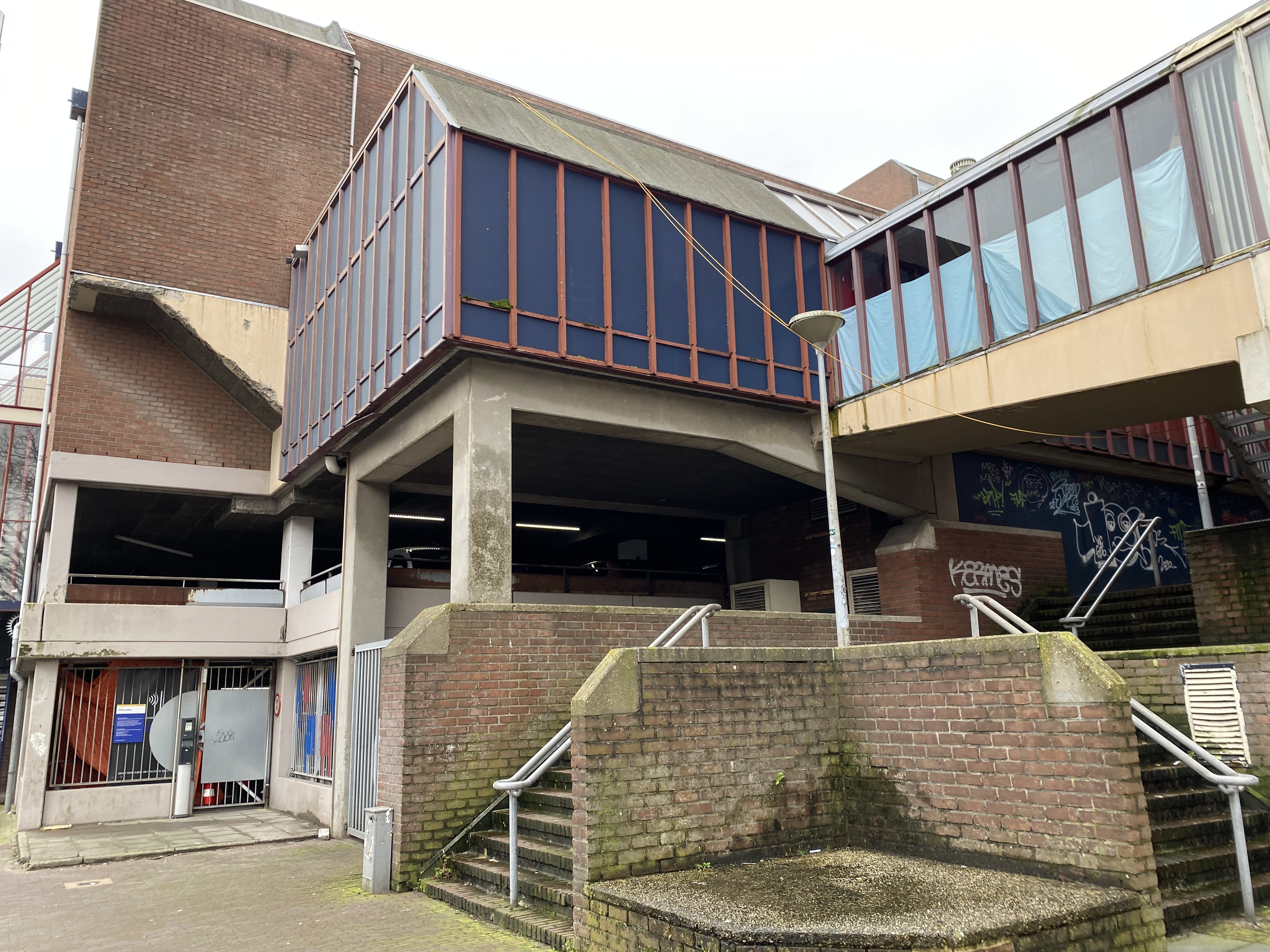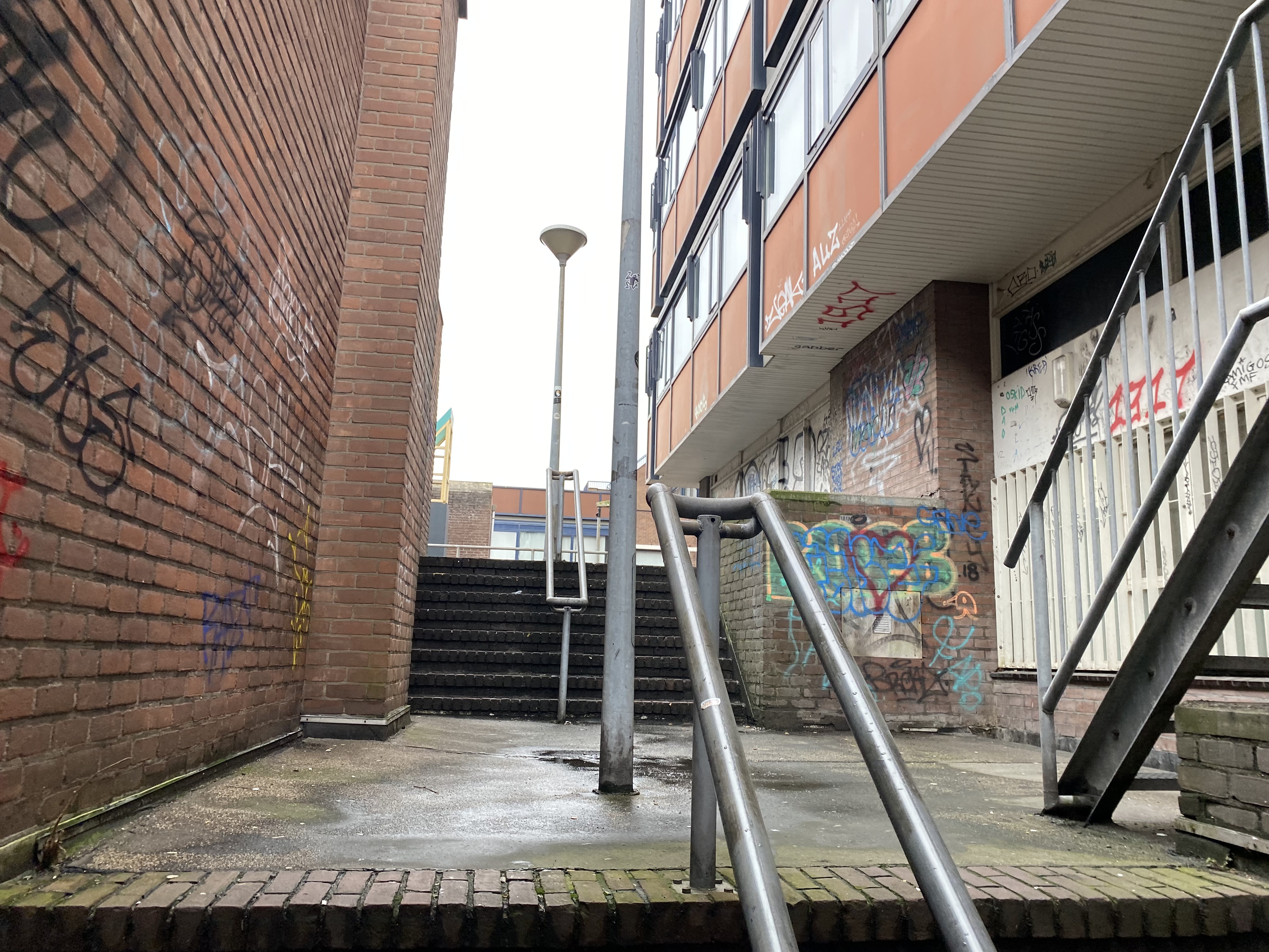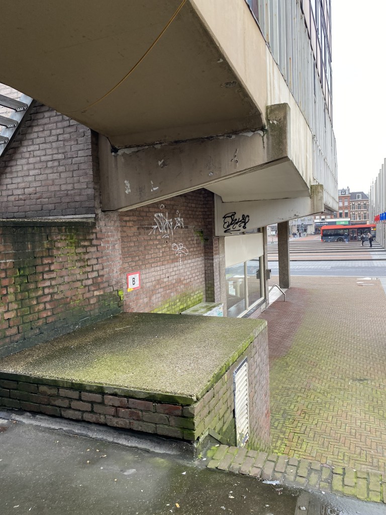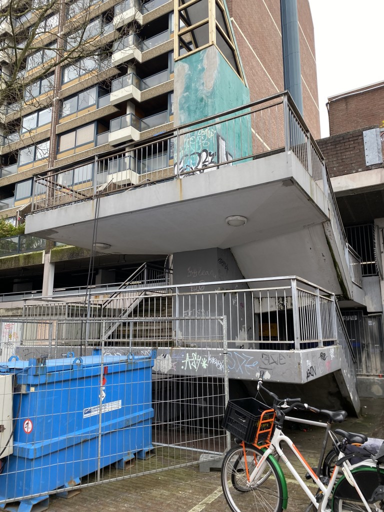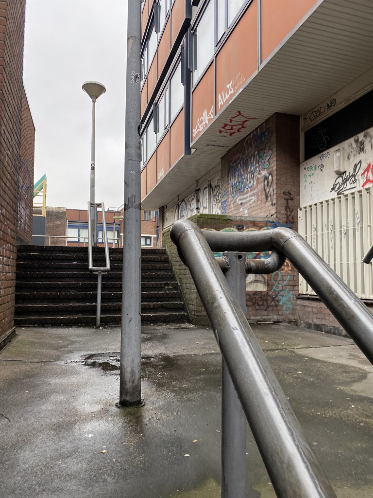 Beresteyn en Beyneshal zitten vol met leuke stukjes ruimtelijk denken uit de jaren ’70: steile trappen, terrassen, hekjes en onvindbare ingangen. Alles uitgevoerd in machinale baksteen, afbladderend staal en natuurlijk veel beton. Onverwachte en disfunctionele hoekjes vormen muffe en vochtige plekjes die alle vormen van afval een veilig toevluchtsoord bieden.