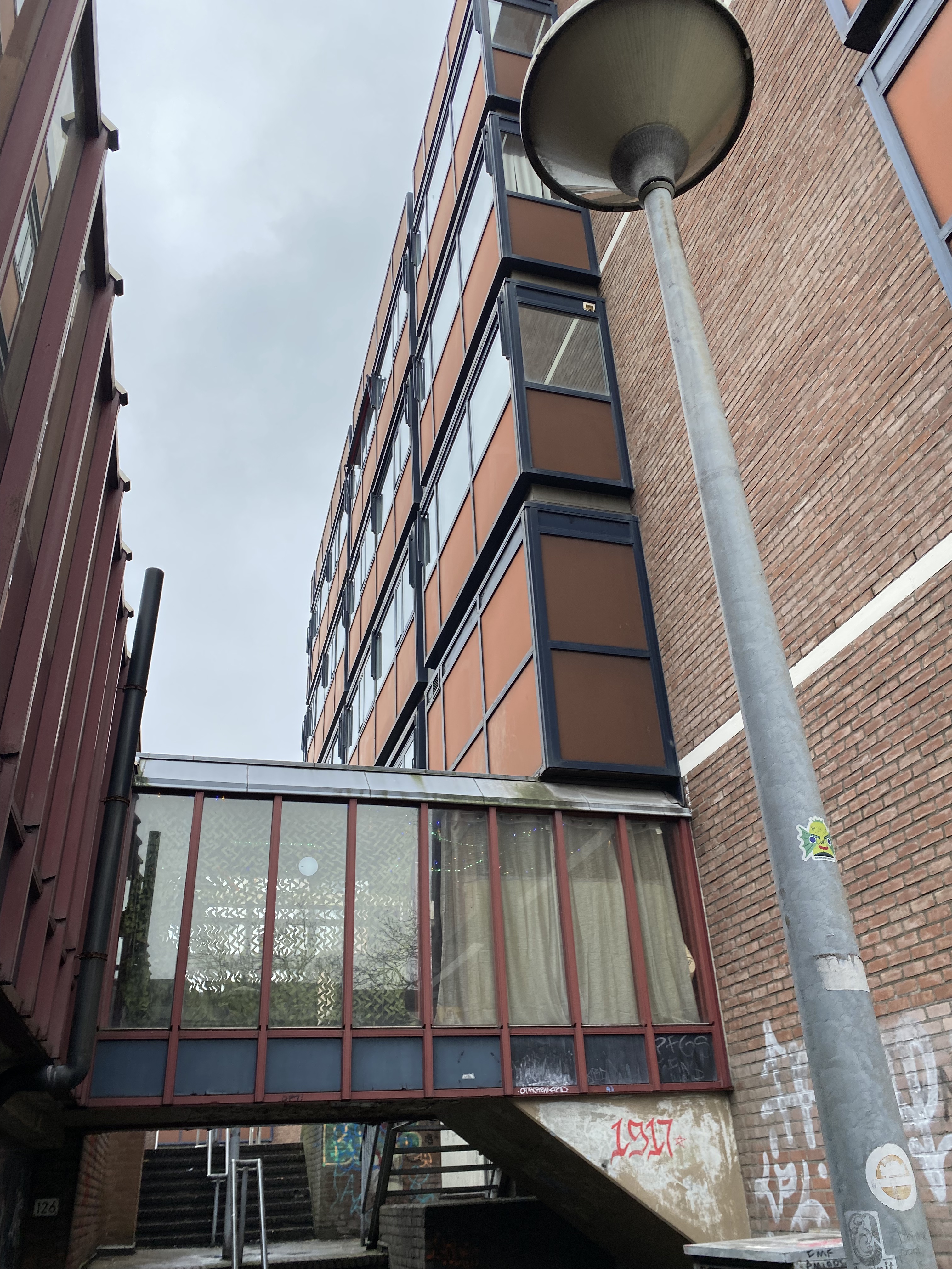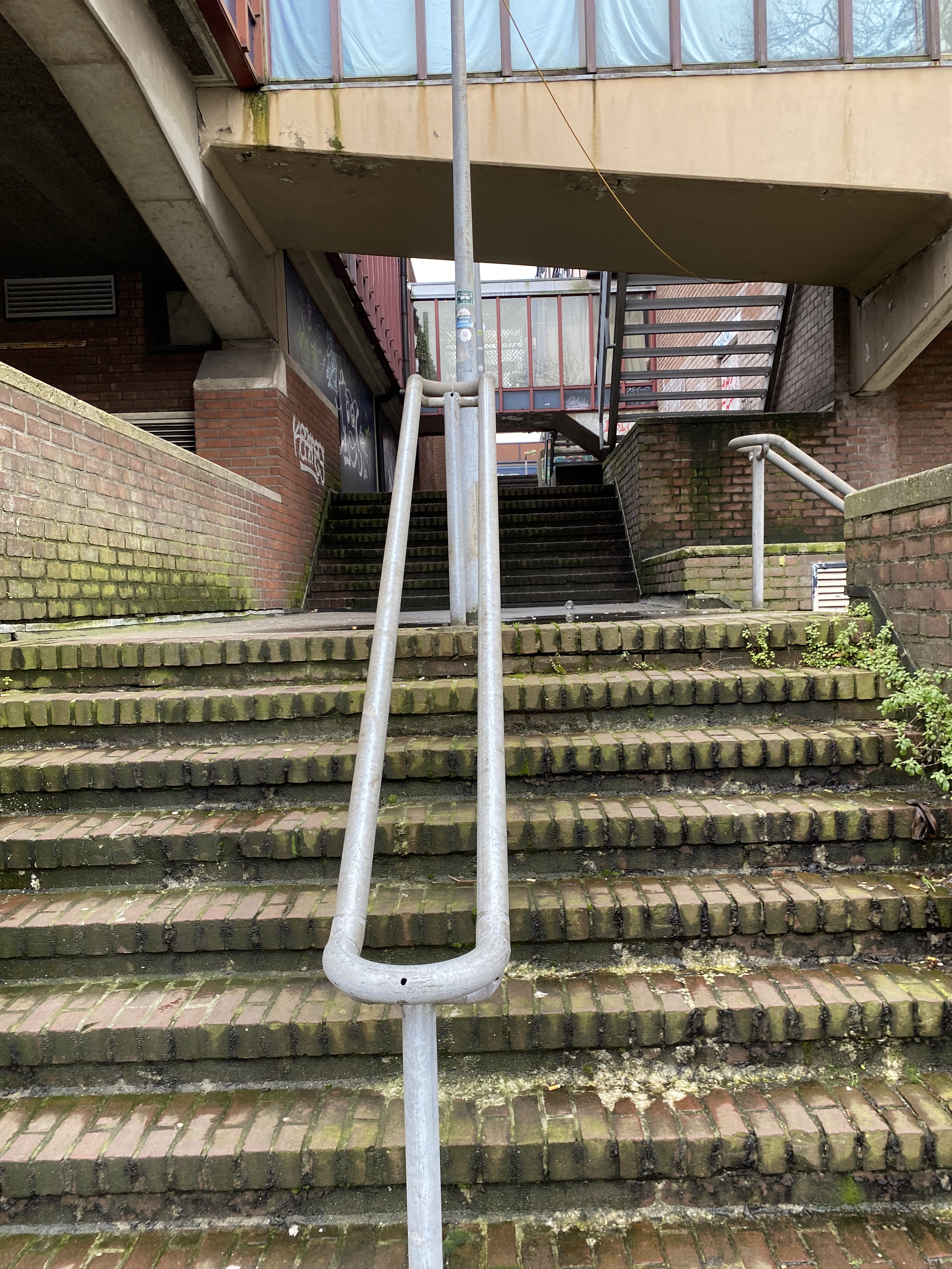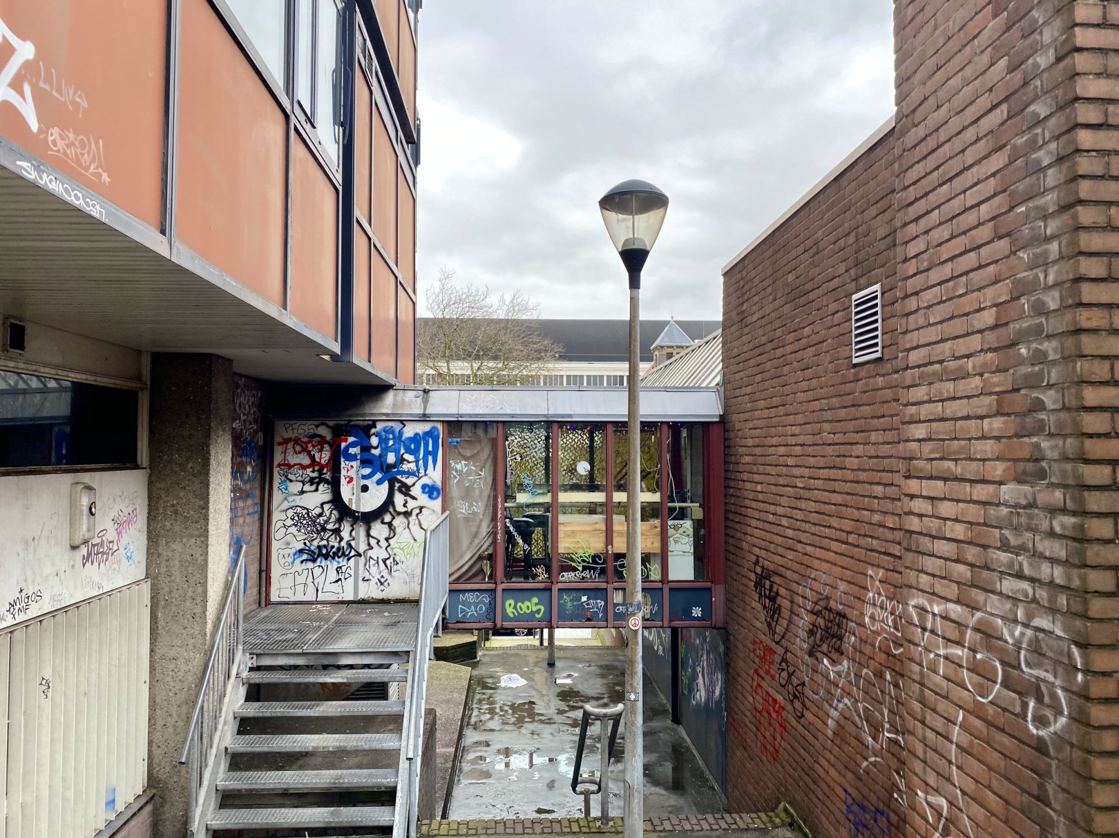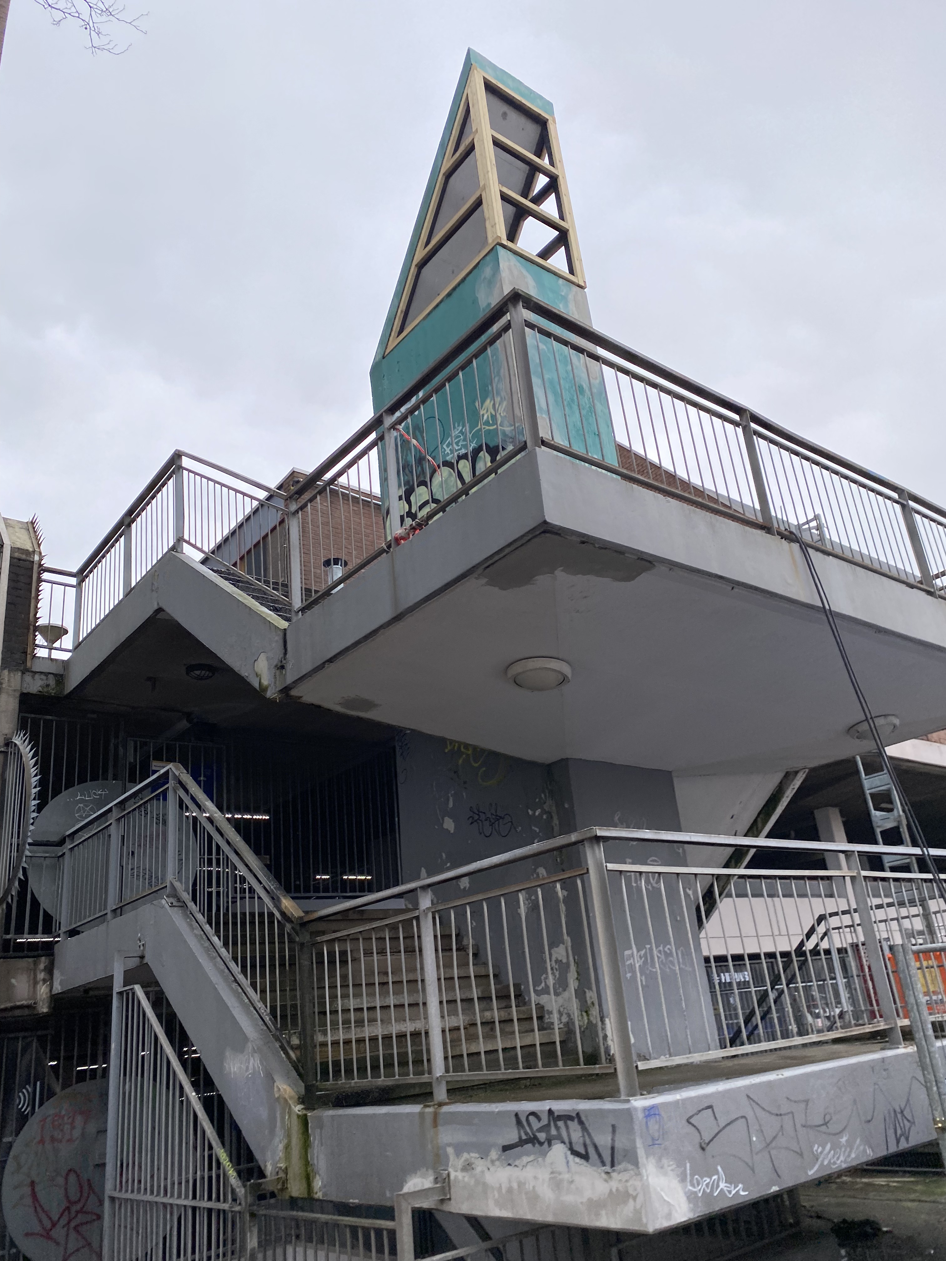 Beresteyn en Beyneshal zitten vol met leuke stukjes ruimtelijk denken uit de jaren ’70: steile trappen, terrassen, hekjes en onvindbare ingangen. Alles uitgevoerd in machinale baksteen, afbladderend staal en natuurlijk veel beton. Onverwachte en disfunctionele hoekjes vormen muffe en vochtige plekjes die alle vormen van afval een veilig toevluchtsoord bieden.