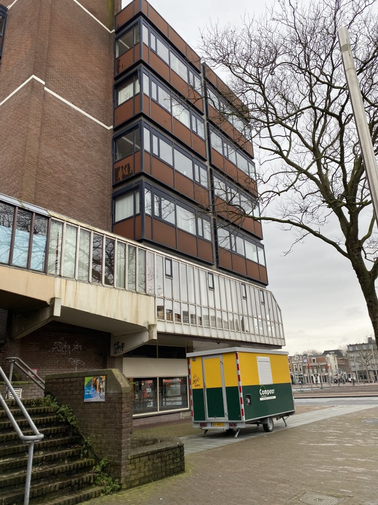Het steegje leidt naar een terras dat via brede trappen weer aansluiting geeft op de rest van het stationsplein. Daar wordt meteen duidelijk dat de Beyneshal nog meer verrassingen in petto heeft: Hij maakt namelijk deel uit van iets groters: het multifunctioneel complex Berensteyn. Ook deze naam grijpt terug op het verleden. Tot de herinrichting van de jaren ‘60 bevond zich hier een 19e eeuws hofje -het Berensteyn hofje. Klinkt romantisch, maar het was in feite een vorm van armenzorg. De vorm van het hofje is voor kenners nog enigszins af te lezen aan de plattegrond, maar je hebt er veel fantasie voor nodig.  Als er al sprake is van continuïteit lijkt die vooral verticaal vorm gegeven: De shabby flat herinnerd in niets aan knusheid en wekt evenmin de indruk een vrijwillig onderdeel van de woon carrière te zijn.